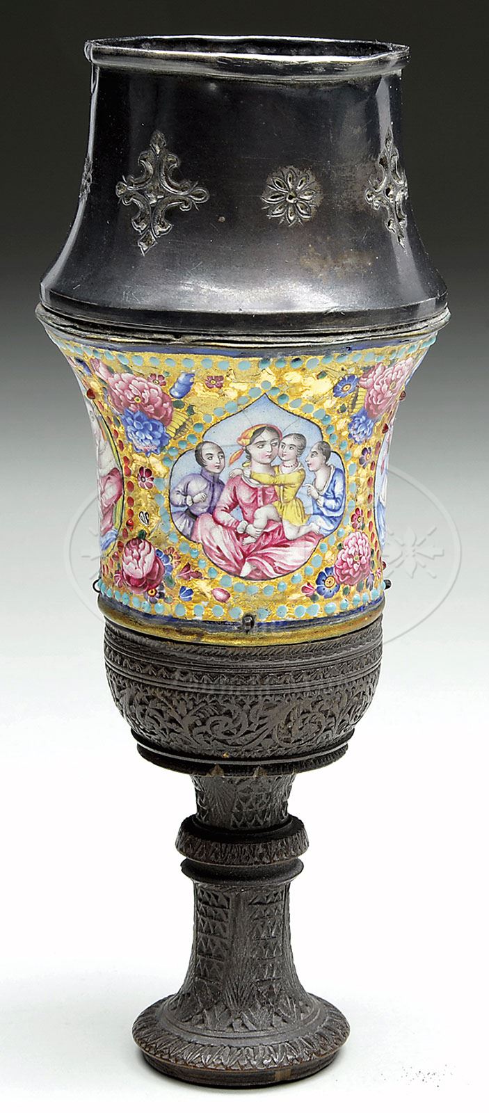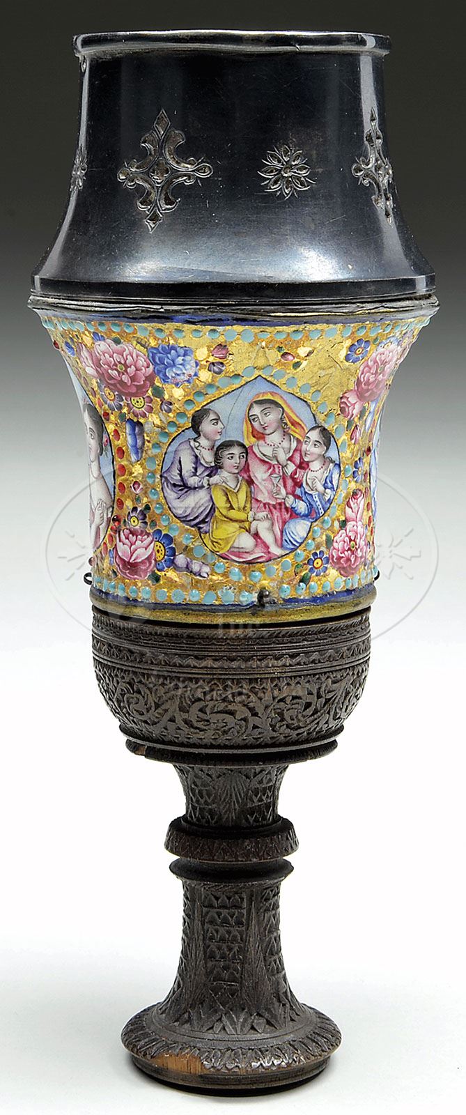 HOOKAH WATER PIPE BOWL. Qajar period (1840-1890), Persia. Qaliyan of silver, wood, and an enameled section. Finely decorated with women and children in reserves on a flower strewn gold ground with borders of “jewels” of red and blue enamel. SIZE: 8″ l. CONDITION: Restoration to gold ground and hairline cracks in reserves. Small chip in side of wooden foot. 7-74525 (400-600)