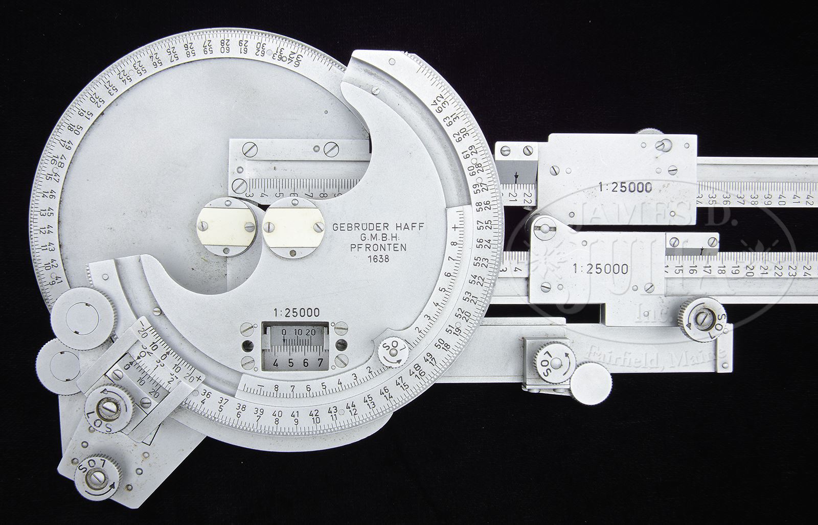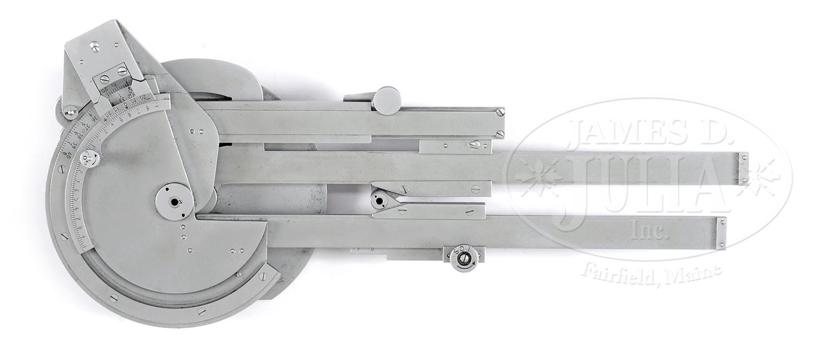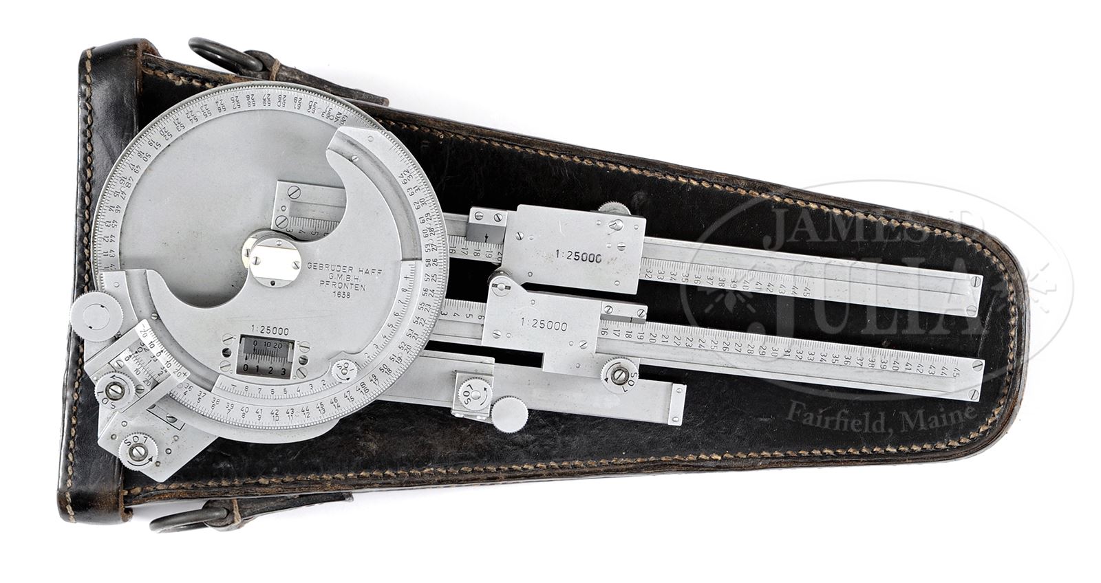 RARE MG34 MACHINE GUN INDIRECT FIRE CALCULATOR WITH LEATHER CASE.Half-dial is marked “GEBRUDER HAFF/G.M.B.H./PF RONTEN/1838”. Black leather case is marked “Gebruder Haff/ G.m.b.H./ Pfronten/1938” over eagle “WtA 11” on back. Strap attachments on sides. Belt loops on back. Lid with stud closure. PROVENANCE: Collection of Dr. Geoffrey Sturgess. CONDITION: Very fine, calculator is complete and functional with very little wear to the satin chrome finish. Leather case is solid with minor scuffs and wear on edges. Minor cracking on strap creases, stitching retains orig color. 43475-1083 BWS (2,000-3,000) – Lot 3793