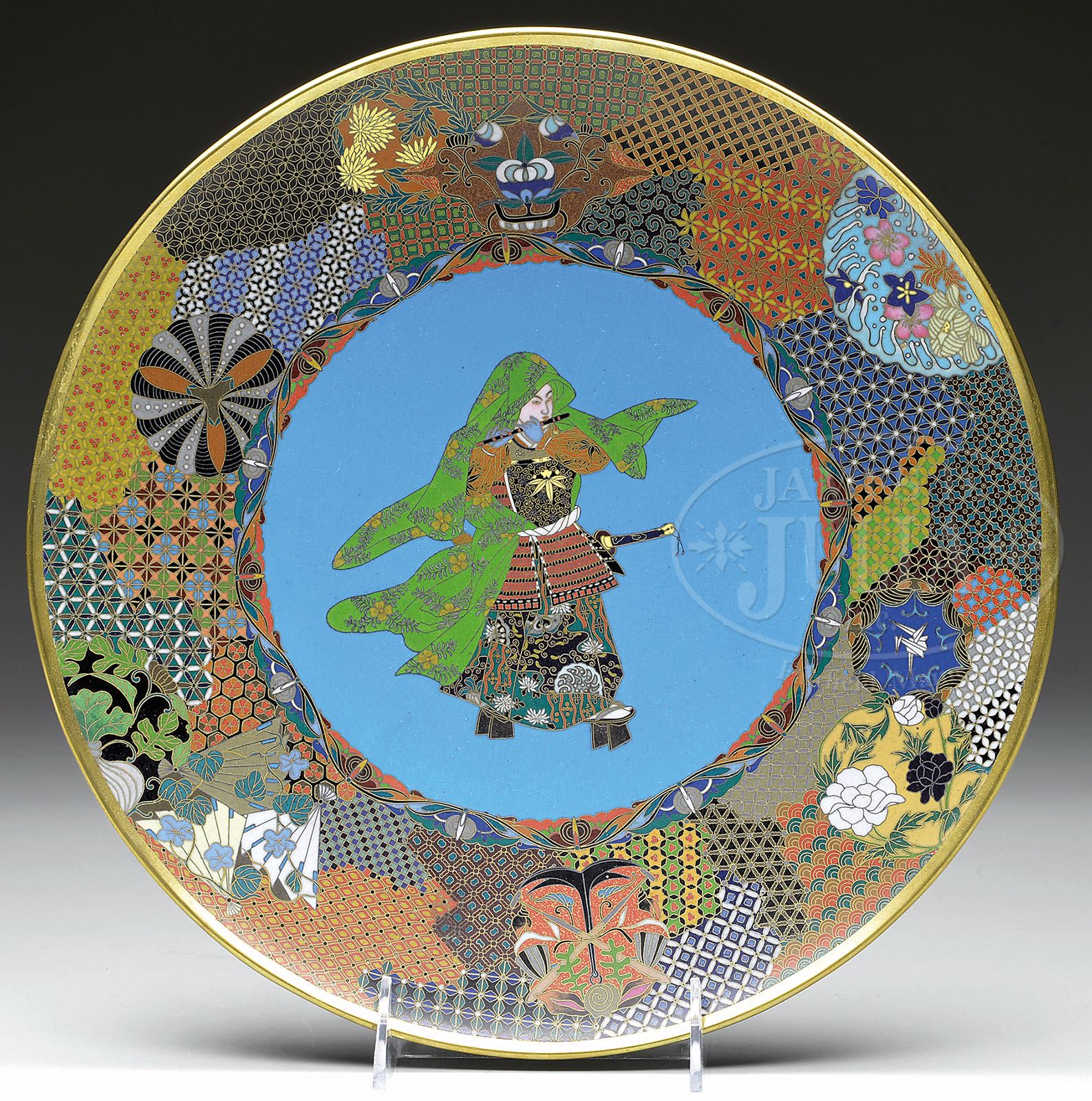CLOISONNE PLATE. Meiji period (1868-1912), Japan. Decoration of a warrior playing a flute, with brocade borders, reverse with a bunch of grapes. SIZE: 12″ d. CONDITION: Very good. 7-74410 (300-500)