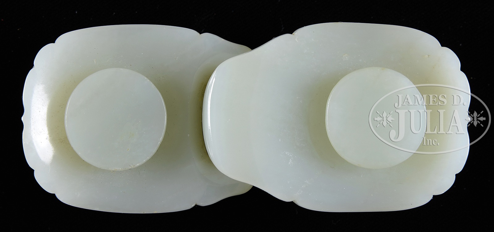 CARVED JADE BELT BUCKLE.18th to 19th century, China. Surface carved in high relief with Chih Lung. SIZE: 4-1/4″ l x 2″ w. CONDITION: Fissures to one part, very good. 7-74806 (300-500) – Lot 3804