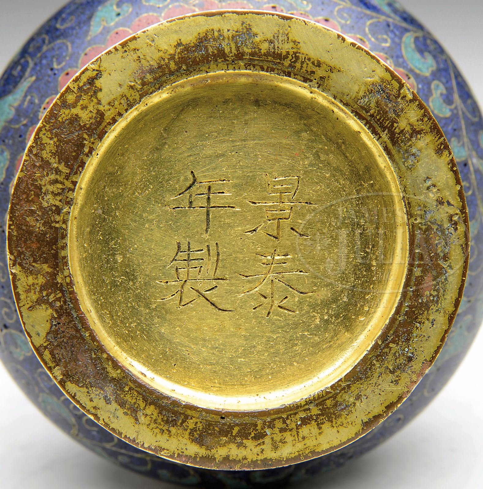 CLOISONNE VASE. 18th century, China. Touhou vase of cloisonne enamels with design of stylized lotuses on dark blue ground. Ching Tai mark on the bottom. Accompanied by box. SIZE: 6” t x 3” dia. PROVENANCE: The Estate of John Gerhardt Family Trust. CONDITION: Very good. 9-25037 (700-900)