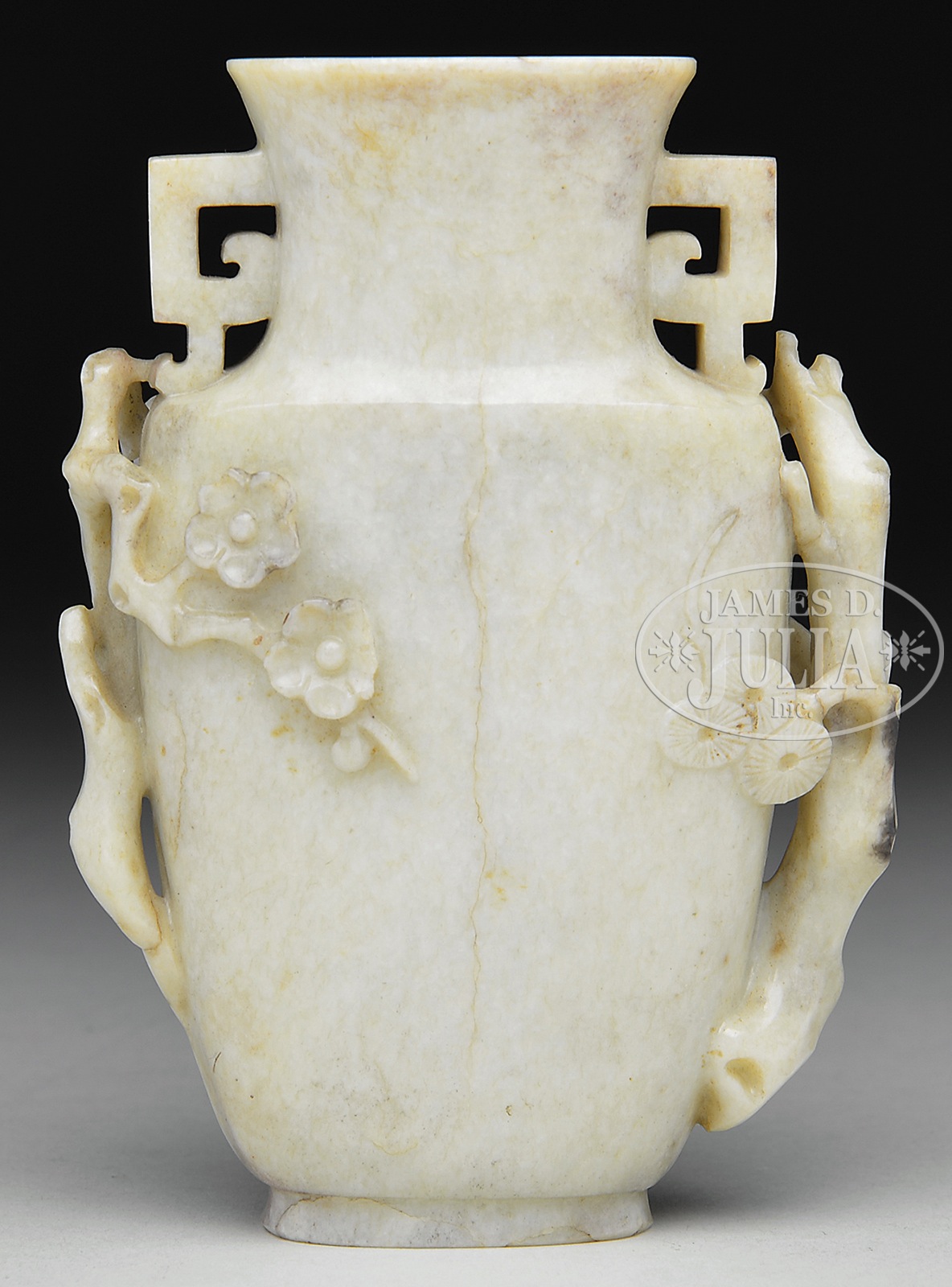 JADE VASE.18th/19th century, China. Chicken bone light stone. Surface carved with prunus and pine. SIZE: 4-1/2″ h. CONDITION: Loss to petals on prunus. 7-74693 (400-600) – Lot 3809