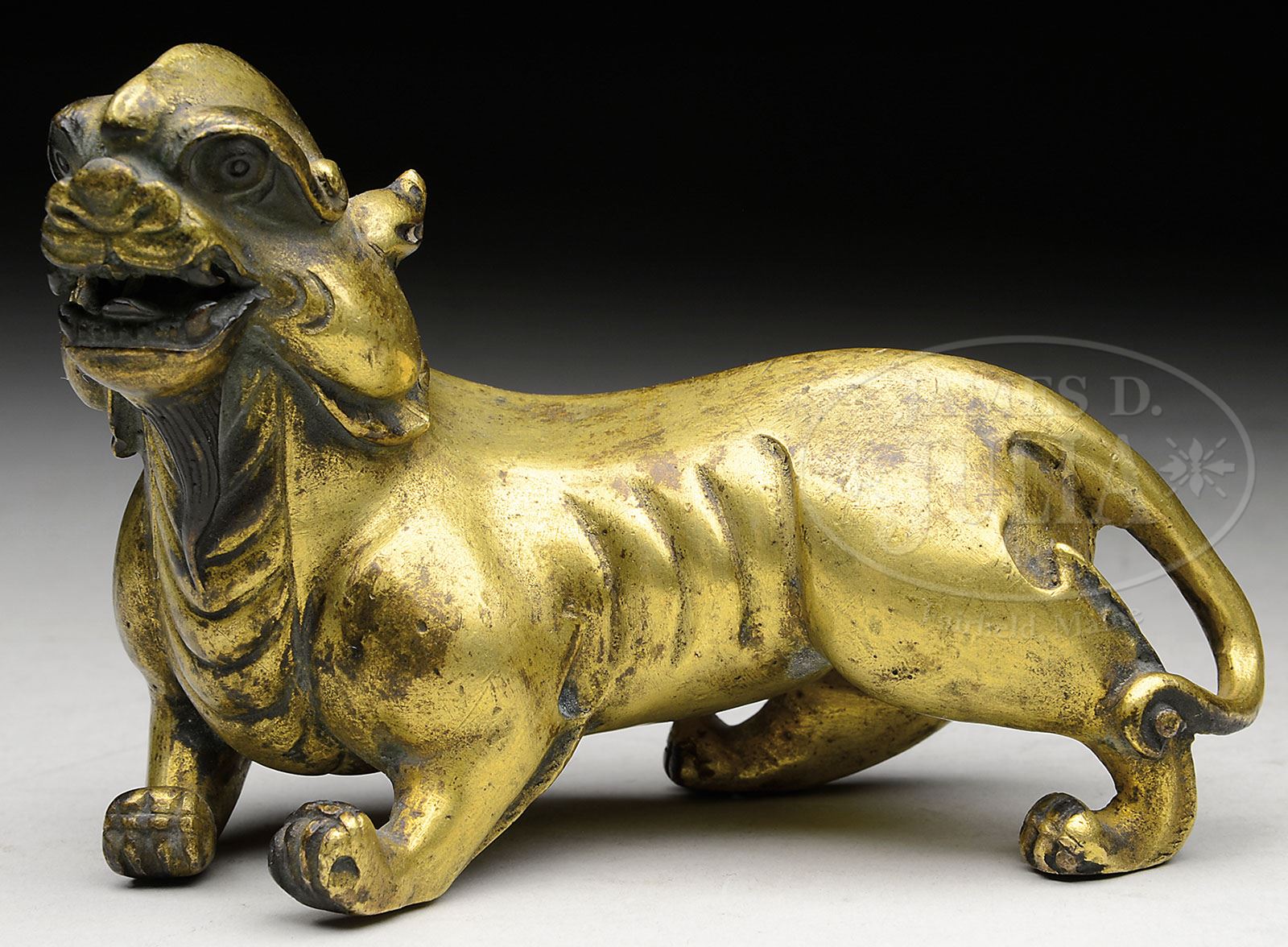 GILT BRONZE PAPERWEIGHT. 19th century, China. Gilt bronze paperweight in the form of a mythical animal. SIZE: 3″ h xm 4-1/2″ l. CONDITION: Very good. 7-74450 (200-300)