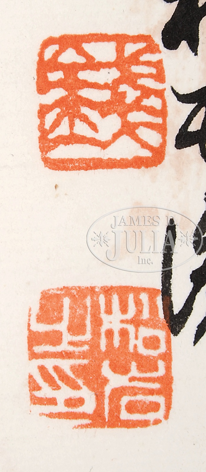 TWO HANGING SCROLLS.China, ink and light colors on paper, one in the manner of Wu Qinmu, depicting a wintry landscape with snow, inscribed, signed “Wu Qinmu,” with two seals; the other in the manner of Qian Songyan, depicting pine trees and cottages, with lengthy inscription, signed “Songyan,” with two seals. SIZE: 54″ x 15″, 31 ½” x 18 ¼” CONDITION: First: extensive foxing; second: good condition. 9-91446 (400-600) – Lot 3823
