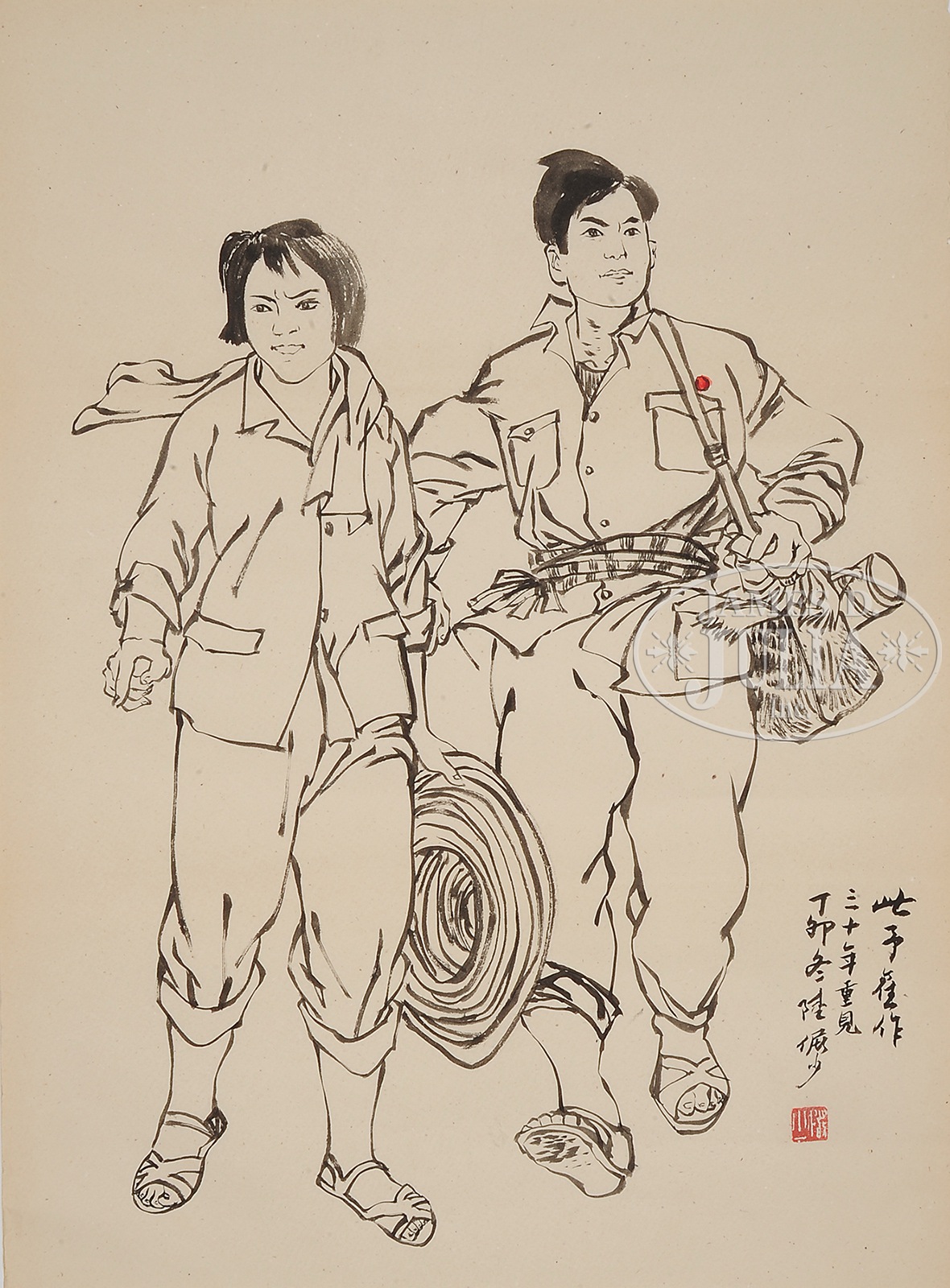 FOUR ALBUM LEAVES.China, 20th century, in the manner of Lu Yanshao. 1) Ink and light color on paper, depicting a peasant and a soldier walking, each holding a red pamphlet. 2) Ink on paper, depicting a mother and a child. 3) Depicting two workers. 4) Depicting a worker holding biandan, each dated dingmao year, signed “Lu Yanshao,” and with one seal. SIZE: 21-1/4″ x 15-1/4″. CONDITION: Good. 7-75195-3 (400-600) – Lot 3827