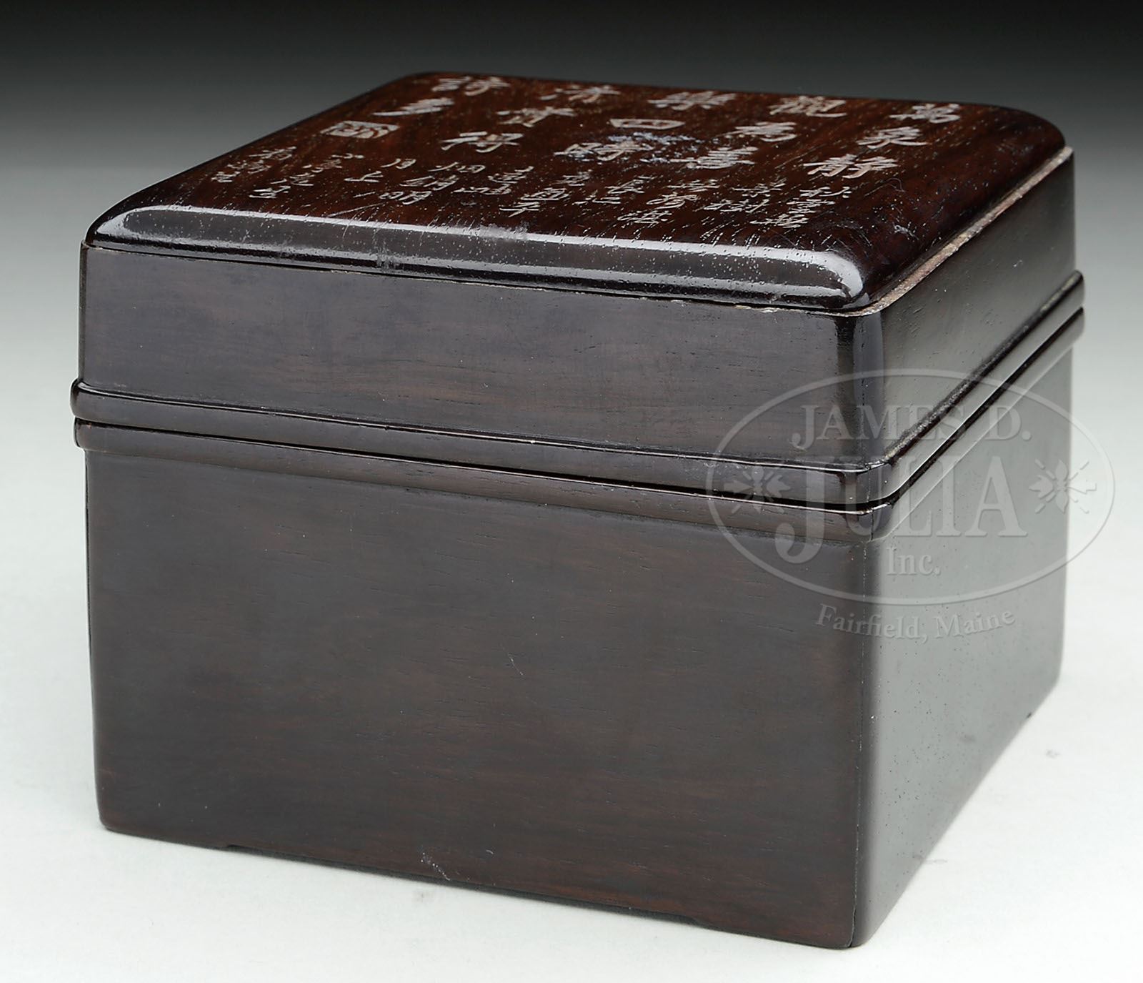 ROSEWOOD BOX. China, 19th Century. Square form finely carved with an extensive inscription. SIZE: 3-1/2″ h x 4-1/4″ w x 4-1/4″ d. CONDITION: Very good. 9-90773 (800-1,000)
