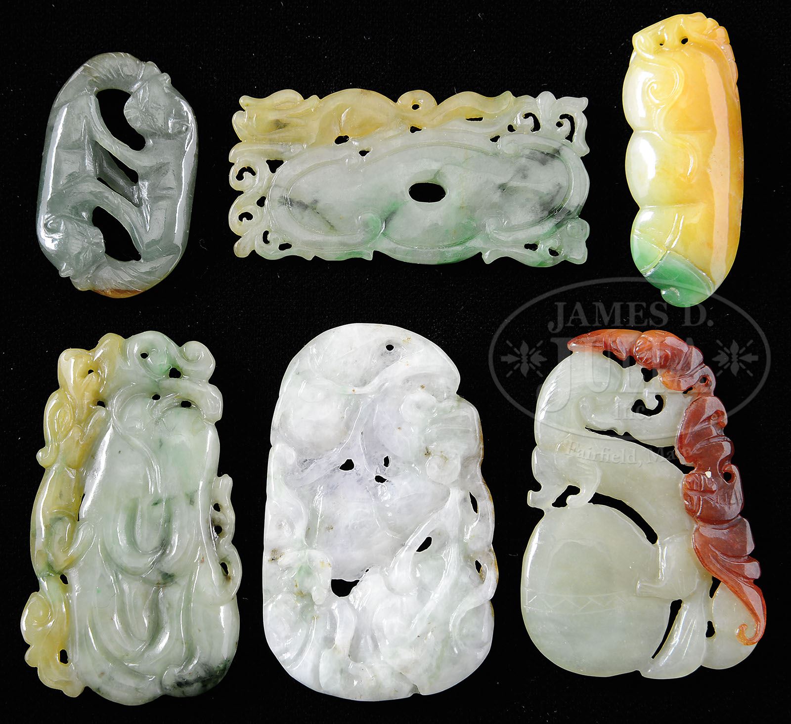 SIX JADEITE PENDANTS. 19th/20th century, China. Varied colored stones. SIZE: Largest 1-3/4″ t. CONDITION: Very good. 7-74456 (200-300)
