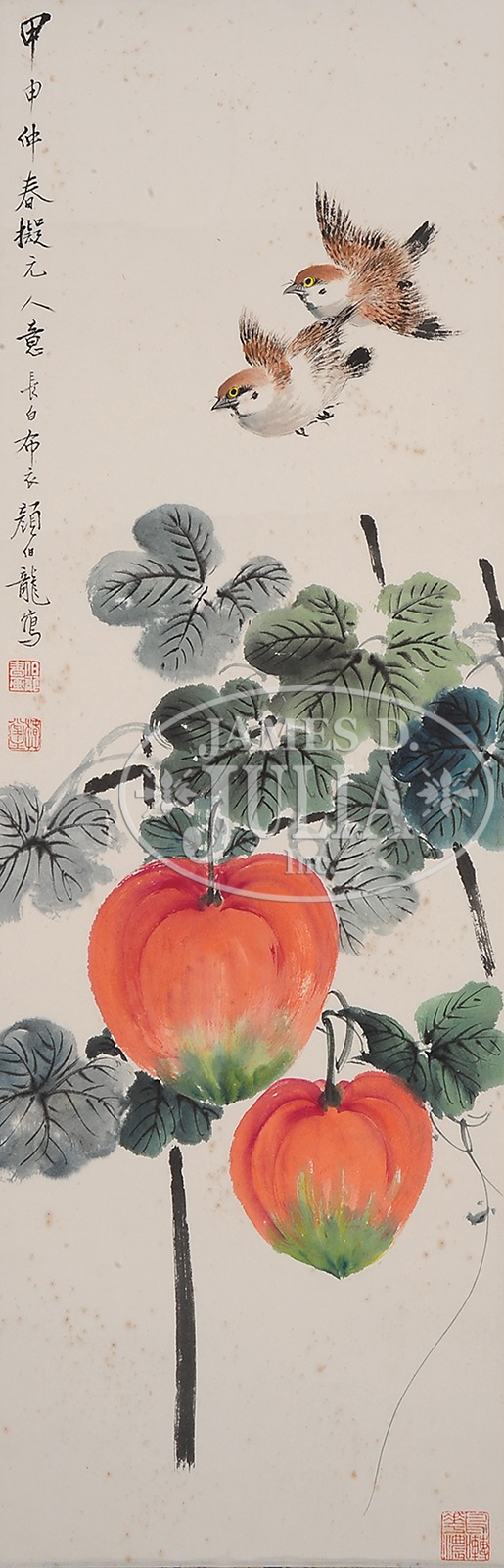SET OF FOUR HANGING SCROLLS ATTRIBUTED TO YAN BOLONG.China. 1) Finely depicting two parrots resting on pine branches growing from rockery. 2)Depicting two magpies on leafy branches, dated jiashen year. 3) Depicting two sparrows flying above fruity branches. 4) Depicting two birds perched on peach blossoms, dated mid-spring in jiashen year, each inscribed, signed “Changbai bu yi Yan Bolong,” with three seals. SIZE: 27-1/4″ x 9″. CONDITION: Extensive foxing. 7-75195-4 (700-900) – Lot 3855