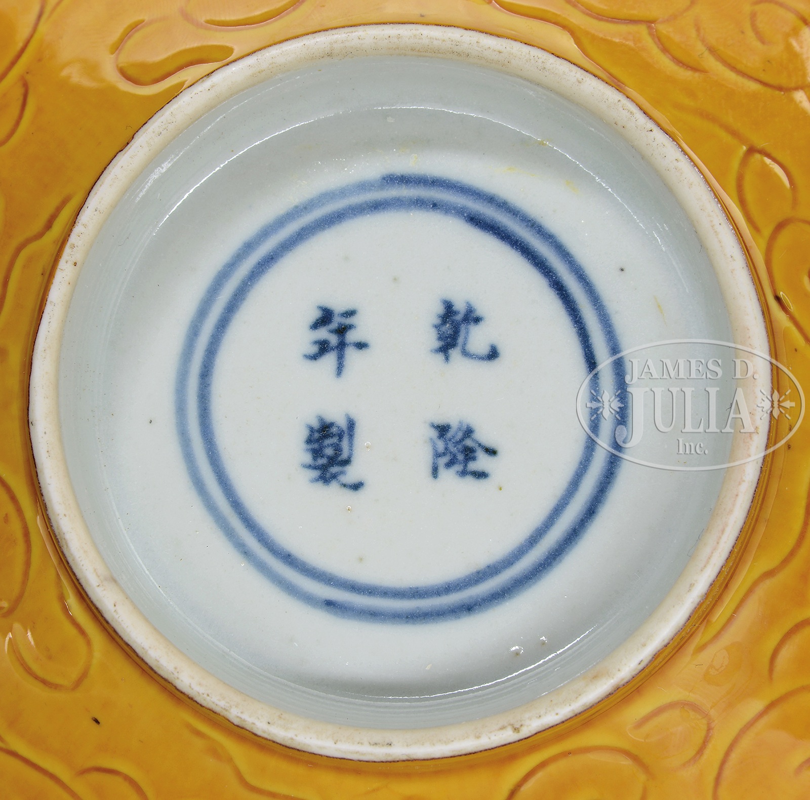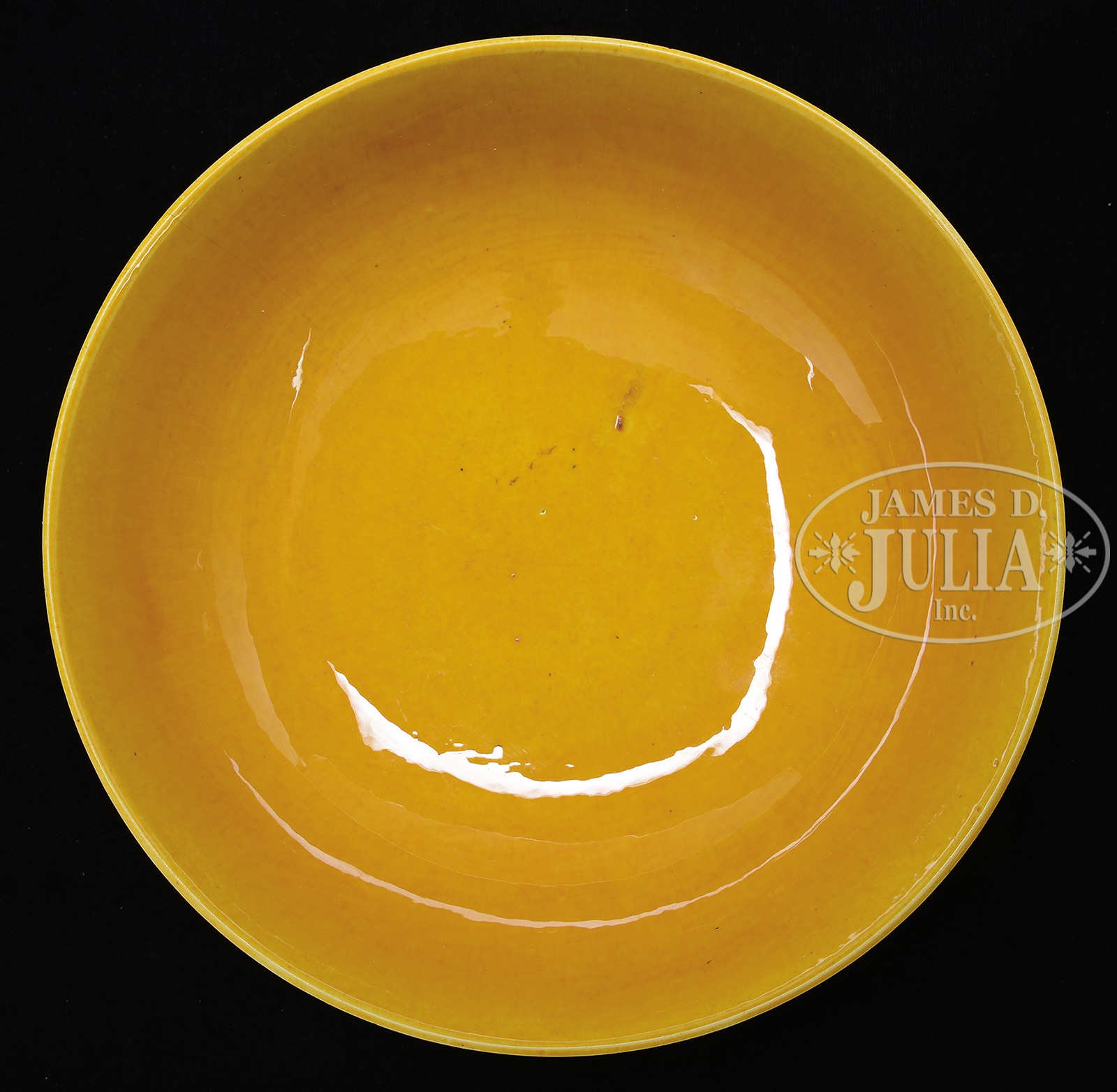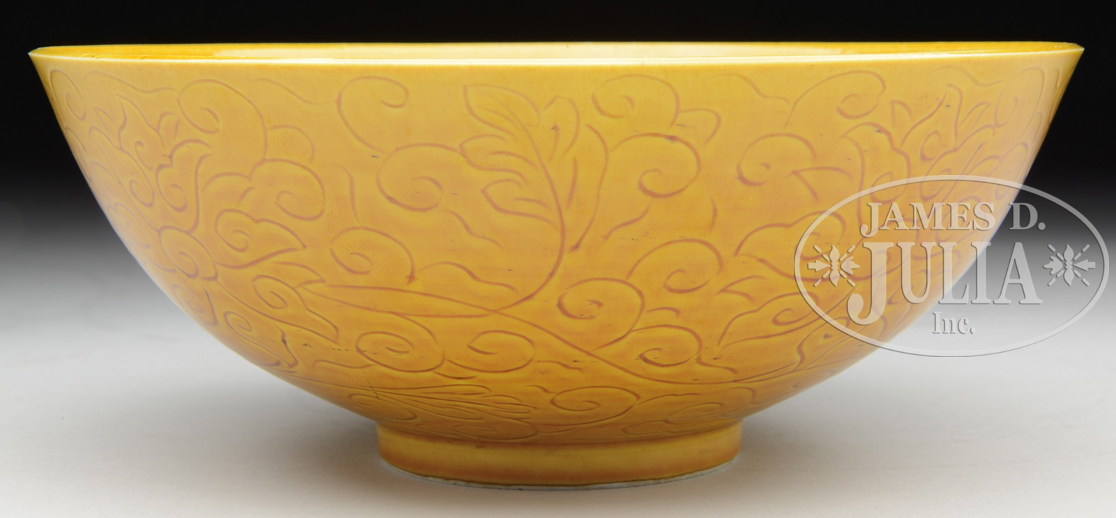 EGG YOLK GLAZED PORCELAIN BOWL.20th century, China. The bowl of shallow form incised around the exterior with a network of vines and lotus blossoms all done under a rich egg yolk yellow glaze which continues to the interior. Stands on a tall foot with the underside having a four character Qianlong mark. SIZE: 3″ h x 7″ dia. CONDITION: Two hairline extending from the rim. 48843-1 (800-1,200) – Lot 4000