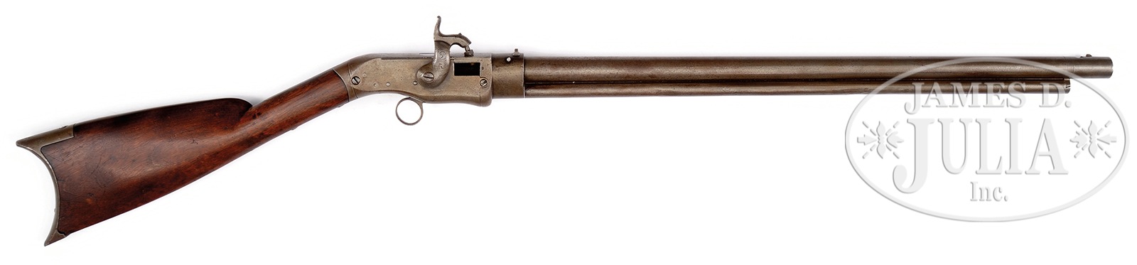 SN 213. Cal. 54. Very rare rifle appearing in configuration of 2nd model with magazine tube beneath bbl, exposed ring trigger with no trigger guard, missing automatic priming device using pill lock, and converted to percussion and smooth bored to 58 Cal. These rifles were invented by Lewis Jennings of Windsor, Vermont and produced by Robbins & Lawrence in Windsor, Vermont in very limited quantities. They were originally produced as repeating rifles utilizing the Hunt “rocket ball” which was a hollow bullet with the powder inside covered with a pierced paper which allowed the powder to be ignited by the pill primer. They were grossly under-powered and unsuitable for either hunting or defense and therefore almost completely unsuccessful. When this became apparent Jennings stopped production of the repeater and either converted already produced repeaters into single shot breech loaders such as this one or manufactured them from existing parts. This conversion is not factory and was done by a local blacksmith or gunsmith for someone who wanted to continue use when rocket ball ammunition was no longer available. It is unknown how many were actually made but it can be surmised that it was only a very few, making this one of the most rare American production rifles ever made. Rifle has 25-5/8″ heavy rnd bbl with tiny brass front sight and dovetail mounted rear sight. It has flat sided receiver with no discernible markings, only SN “213” on lower tang. Mounted with straight grain, American walnut stock with 2-3/4″ oval German silver plaque and orig crescent buttplate. CONDITION: Fair to good. Metal is overall grey/brown, heavily cleaned and priming mechanism as noted, gun will still cock. Stock is sound and well fit with scattered small blemishes. Bore is clear and pitted. 50974-1 JS (6,000-8,000) – Lot 4000