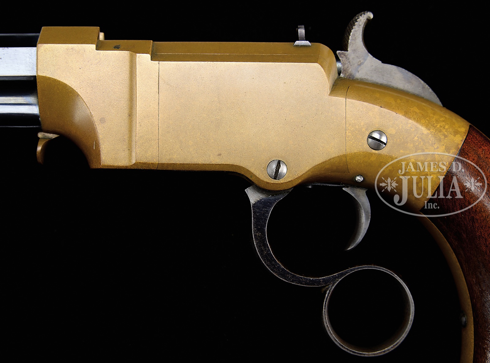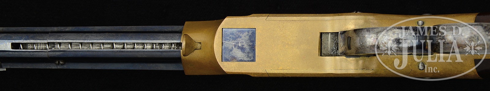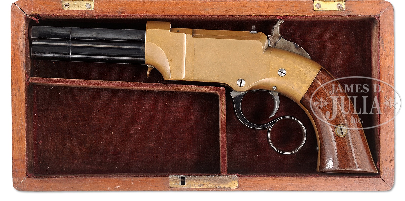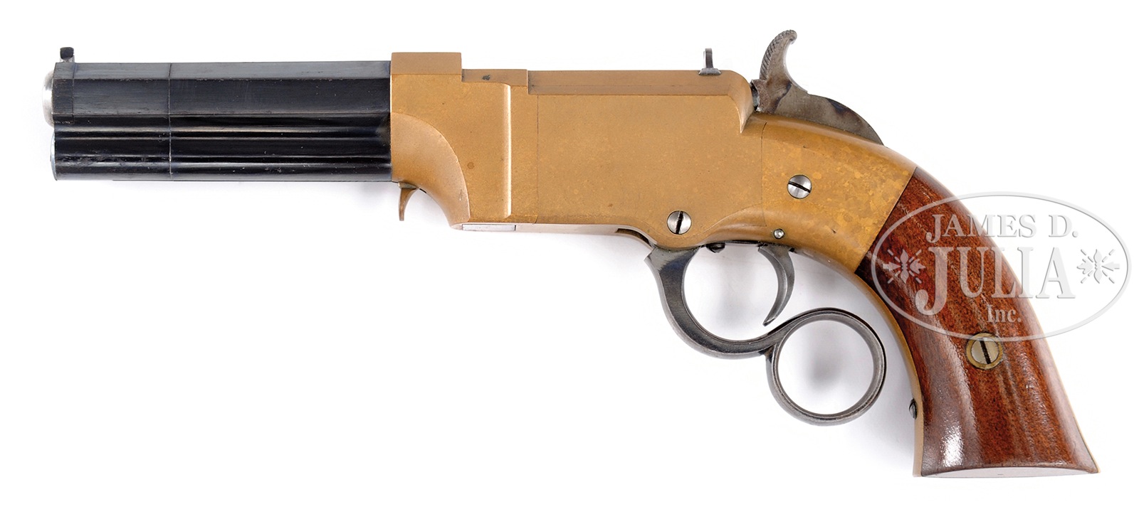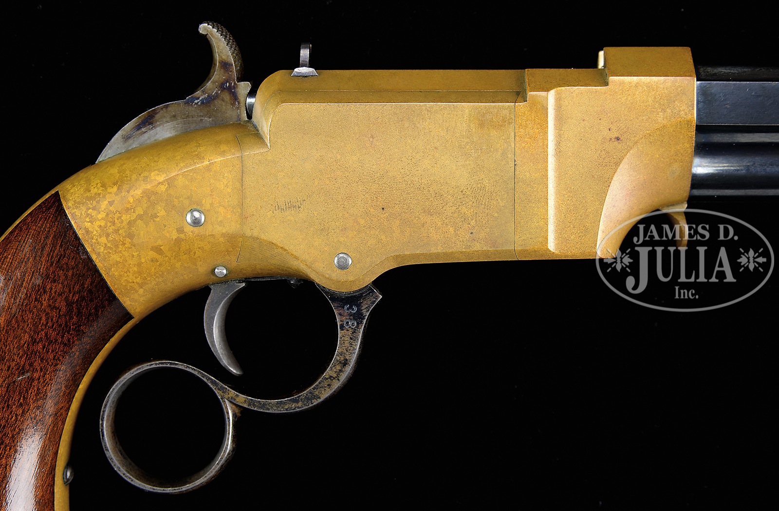 SN 38. Cal. 31. 3-1/2″ bbl. Blue finish. Gun metal receiver. Case colored hammer. Blue lever. 2-pc varnished walnut grips. Bbl shows 2-line address that reads “New Haven Conn. over Patent Feb. 14. 1854”. Because of the pristine condition and tightness of front-sight, which holds the collar in place, the collar was not removed to check for an assembly no. but it is absolutely certain that both parts are totally matching. Flats line up perfectly. SN is stamped on lower left side of grip frame and on upper inside of each grip. No other nos. were observed. Case is mahogany with a purple felt lining and is made for this model of pistol. CONDITION: Excellent. Bbl retains nearly all of orig deep-blue finish, with only very slight high point wear and muzzle wear. There is a hair line scratch across right side of bbl. Bbl mark is sharp. Bore appears unfired. Face of firing pin shows no evidence of firing. Receiver has a deep rich mottled mustard-brown patina with only the slightest handling marks overall. Sideplates fit perfectly. Rear-sight retains nearly all of fire-blue finish. Rear of firing pin retains nearly all of fire-blue finish. Elevator retains nearly all of fire-blue finish on sides of firing pin. Bottom of elevator also retains considerable fire-blue that has flaked slightly with 1 tiny scratch. Hammer shows most of its vivid trace color on either side, with a few small scratches on right side. Rear of hammer also shows vivid case color, as does the front face of hammer. Hammer face shows some use. Trigger has generous traces of case color and toned. Trigger spring shows nearly all of fire-blue finish. Lever retains most of its bright blue finish. Grips are fine with only a couple of small scratches and very slight high point wear. Case is exceptional. A truly excellent near mint condition example of New Haven Arms No. 1 Volcanic Lever Action pistol, 1 of only approximately 850 made. This is an opportunity for an advanced collector to add a specimen to his collection, that would be almost impossible to improve upon. 51096-3 (50,000-75,000) – Lot 4004