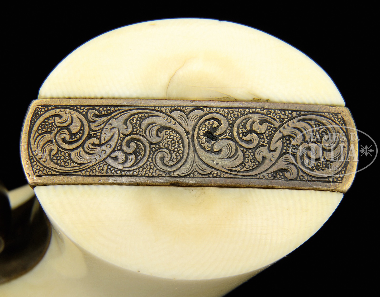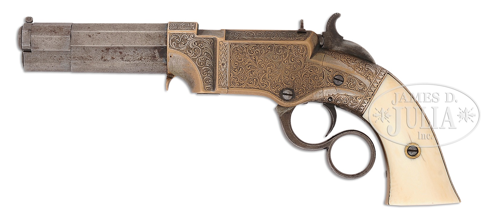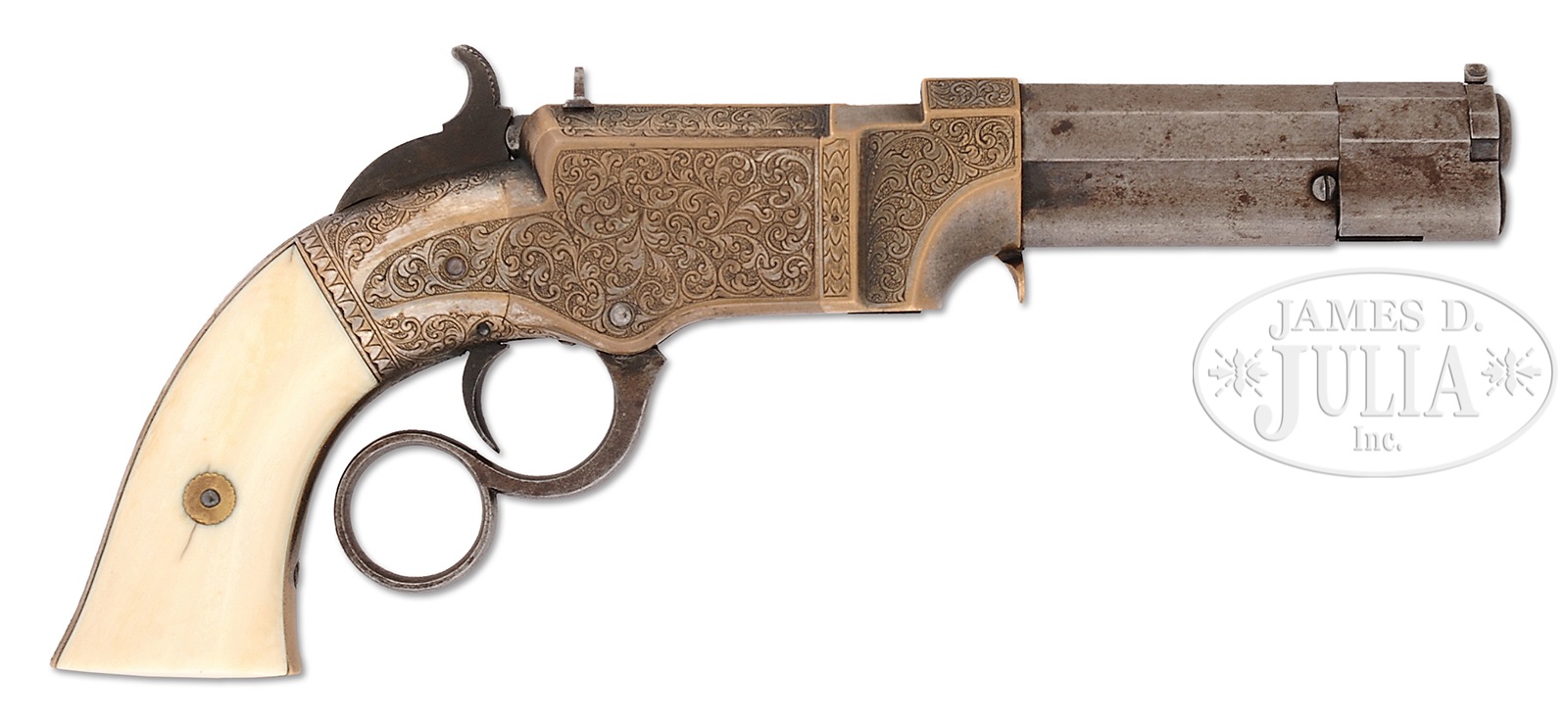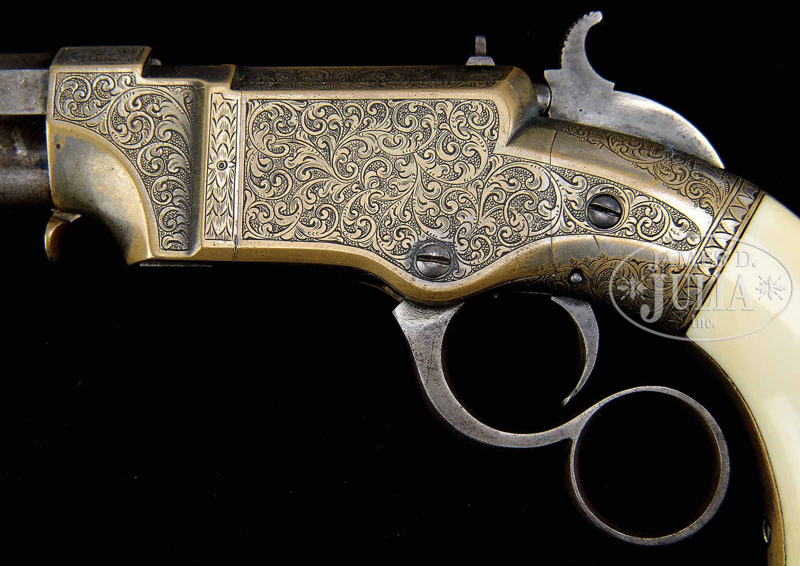 ELABORATELY ENGRAVED EARLY VOLCANIC NEW HAVEN ARMS NO. 1 PISTOL.SN 73. Cal. 31. Blue & silver finish with standard 3-1/2″ oct bbl that has integral magazine and pinched post front sight, with fixed rear sight in the top flat of the frame. Top flat of bbl has the New Haven address and Feb. 14, 1854 patent date. Frame is silver plated gun metal (bronze) with very rarely seen elaborate floral scroll engraving consisting of shaded foliate arabesque patterns which cover about 80% of the frame, around the hammer slot and down the back strap. Mounted with 2-pc smooth ivory grips. SN is on the left side of the butt strap, grips are not numbered. No additional disassembly was effected to check for other matching numbers. According to Flayderman’s Guide to Antique American Firearms there was approximately 1000 No. 1 pistols produced in all configurations. We have never encountered a more elaborate style of engraving on any other No. 1 Volcanic. Special Note: This item(s) contains plant or animal properties that may be covered by the Endangered Species Act (ESA). We have taken care to ensure that this item(s) meets the standard for sale under the ESA. However, certain states and other countries have laws that are more restrictive than the ESA. It is the bidder’s responsibility to ensure that it is lawful to purchase or transport this item(s) into their state, and to obtain the necessary import and export approvals. Delay or failure to obtain any such permit or approval does not relieve the buyer of paying for the item(s) and consummating the purchase. CONDITION: Fine overall. Bbl & magazine retain traces of orig blue in protected areas with balance gray, light staining and pitting. Receiver, sideplates, front & back straps retain about 10-20% orig silver with light edge wear; hammer and lever exhibit traces of case colors in protected areas with balance dark gray. “Certifiable antique elephant ivory” grips are well fit with light ivory patina and small hairline cracks at escutcheons on either side. Mechanically gun functions with exception of a breech block locking when cocked, bore has well defined rifling. 50506-28 (20,000-30,000) IVORY – Lot 4006