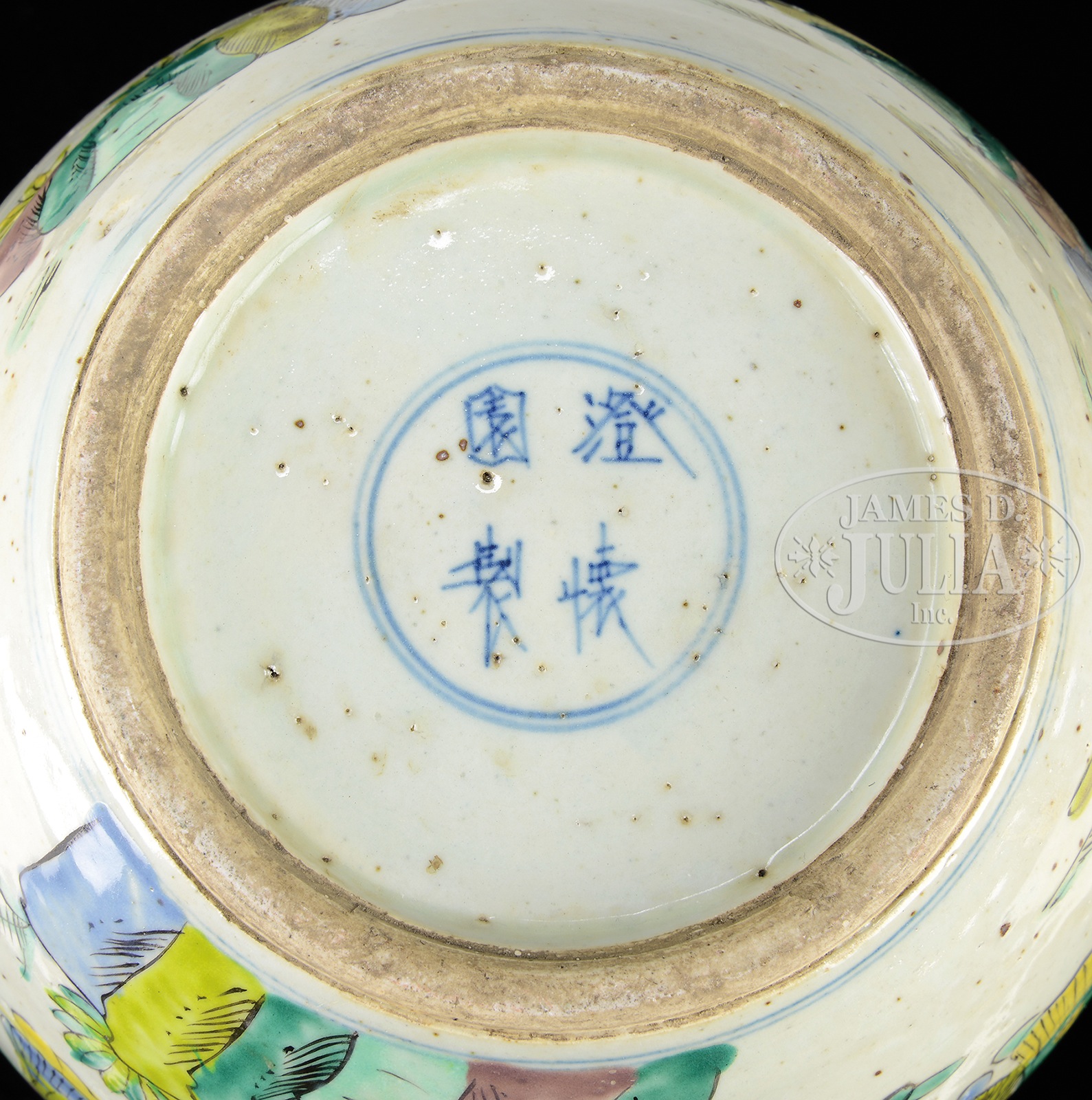 TWO SIMILAR FAMILLE VERTE PORCELAIN COVERED JARS.20th century, China. Each jar painted with scenes of figures within landscapes, all done under a crosshatched border accenting the top rim. Each with a domed cover decorated in a similar motif. Having applied metal handles to the shoulders and finials to the covers. Both jars marked on the underside in underglaze blue. SIZE: One is 11-3/4″ h, the other is 11-1/4″ h. CONDITION: Scattered firing imperfections, otherwise good. 48842-5 (700-800) – Lot 4008