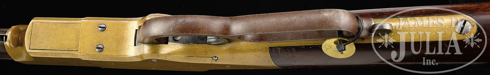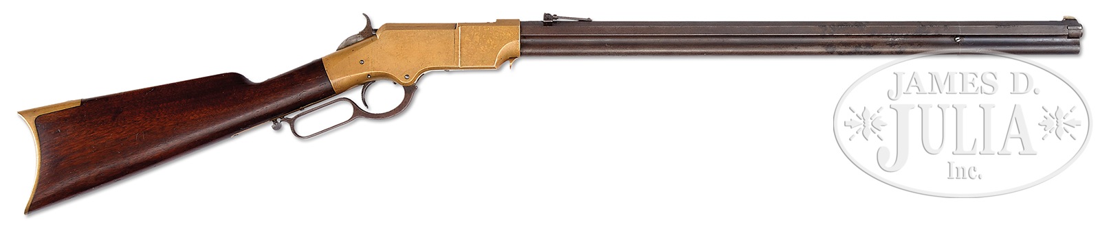 SN 11441. Cal. 44 RF. 24-1/2″ bbl. Blue finish with gun metal receiver. Straight grain American walnut stock. Sling swivels attached on bbl and buttstock. Bbl shows correct large 2-line address rolled in front of rear-sight, with SN at breech-end. Front sight is of the later style, which tapers down toward the muzzle and is square at back. Rear-sight is of the fourth type graduated to 900 yards and has a wide B notch in the bar with retainer. Bbl has a punch dot proof behind SN. Forward top of bbl under collar shows assembly no. 4190. Collar shows no assembly no. but flats align perfectly. Receiver has SN stamped on left tang under buttstock and is otherwise unmarked. Forward lower part of receiver is milled flat for correct large magazine follower. Upper tang mortise of buttstock and inside toe of buttplate show SN stamped. A “Henry Bump” is seen below the sling swivel on left side of buttstock. Screws are not numbered. 4-pc steel cleaning rod in butt. CONDITION: Fine. Bbl shows 10% blue in protected areas with the balance a plumb-brown patina with some roughness on right side behind collar. Bbl markings are sharp. Receiver has a mottled mustard-yellow patina with sharp edges and a few light scratches overall. Hammer is a silver-gray patina with a hint of case color. Lever is a plumb-brown patina. Markings are sharp. Buttstock is fine, full-sized, and shows varnish finish overall with a few slight handling marks. “Henry Bump” is well defined. Buttplate also has a smooth mottled mustard-brown patina with sharp edges and a few stains. A truly fine unmolested late production Henry rifle that would be a welcome addition to any collection. 51033-19 TEP (35,000-40,000) – Lot 4011