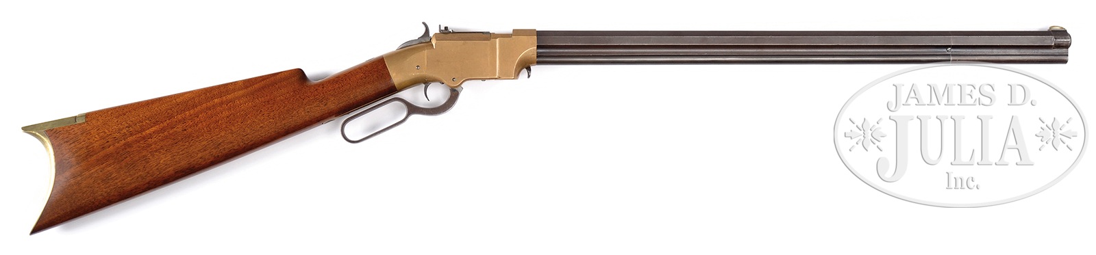 SN 48. Cal. 41. 21″ bbl. Blue finish with integral magazine. Bbl reads “New Haven Conn. Patent Feb. 14, 1854”. German silver front-sight. No cal mark. Gun metal receiver with rear-sight on top, that is adjustable for elevation by means of a knurled screw. SN is stamped on left lower tang. Bottom of receiver has “26” stamped behind elevator. This is possibly a collectors inventory no. Receiver screws have SN stamped on collar. Straight grain American walnut stock. SN is written in pencil in lower tang mortise. Gun metal buttplate has SN stamped on inside of tang. Buttplate screws also have SN stamped on collar. CONDITION: About fine. Bbl shows a smooth plumb-brown patina overall with traces of blue toward the breech in the gullet and on magazine tube. Loading collar was not disassembled, but flats lineup perfectly. Bbl marking is sharp. Magazine follower is loose. Gun metal receiver shows a mustard-brown patina overall with no evidence of heavy cleaning. Sides of receiver show some minor dents and scratches. Sideplates fit well. Receiver sight shows a generous amount of blue. Hammer is a plumb-brown patina. Lever is also plumb-brown patina, with some very slight trace of blue toward the hinge. SN on tang is sharp. Buttstock is a very professional replacement retaining nearly all of the varnish finish. Buttplate shows an even mustard patina, that is bright on the high points. SN is sharp. Screw nos. are clear. A nice example of an early volcanic carbine that has had some restoration. 50506-30 (15,000-22,000) – Lot 4018