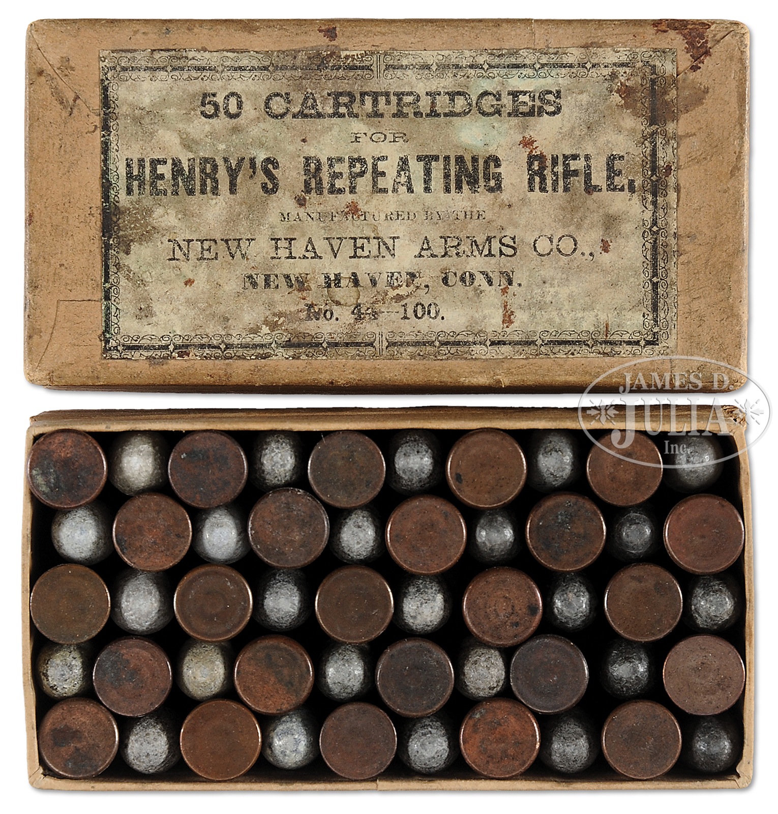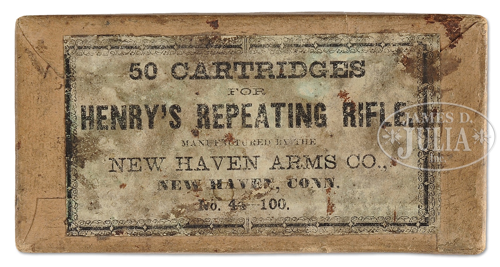 EXTREMELY RARE ORIGINAL CIVIL WAR “GREEN LABEL” HENRY RIFLE CARTRIDGE BOX COMPLETE WITH 50 ORIGINAL CARTRIDGES.SN NSN. This is a nice example of the rarely seen 1862-1863 vintage “Green Labeled” 50 cartridge box. These are rarely found and an identical box is shown on pg 30 of Giles & Shuey One Hundred Years of Winchester Cartridge Boxes. This is a fine orig box containing 50 orig cartridges that would display well with the much easier to find Civil War era Henry rifle itself. CONDITION: Box is very good overall with fading to green color of label with staining. There is a newer ink inscription on the left short side of box describing cartridges. 50818-2 JS (8,000-12,000) – Lot 4021
