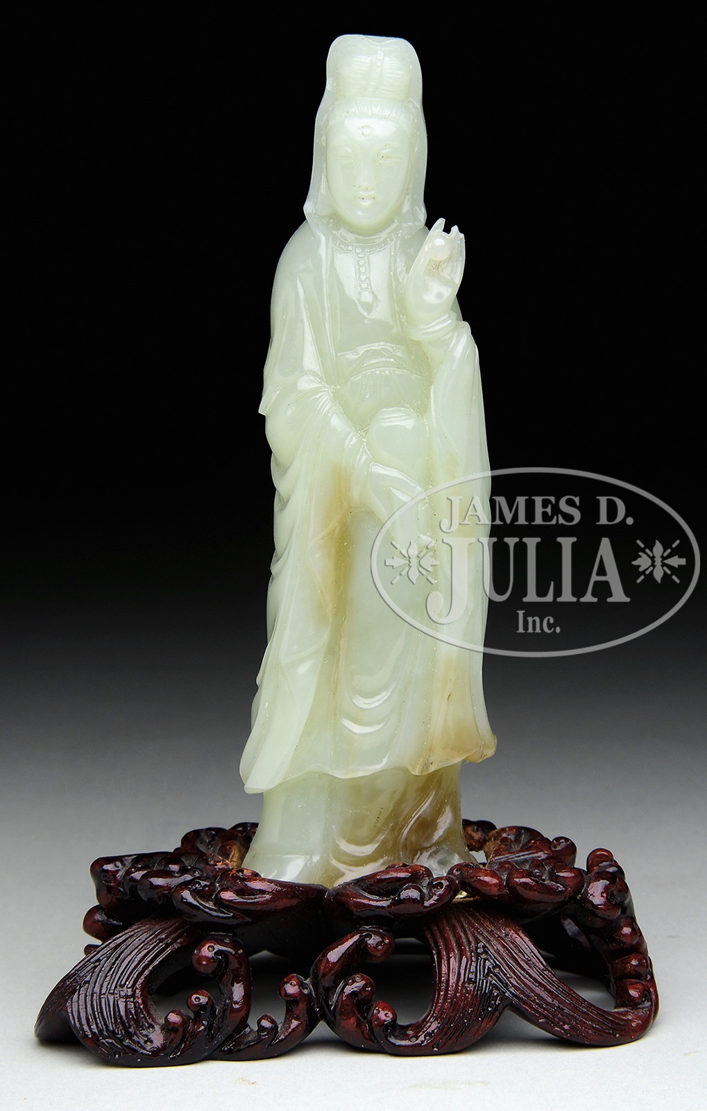 PALE CELADON FIGURE OF GUANYIN.China. Holding a pearl in her left hand, a bottle on the right. Mounted on lacquered wood stand. SIZE: 6-3/4″ h. CONDITION: Guanyin good but affixed to wood stand. 49165-4 (1,000-1,500) – Lot 4022
