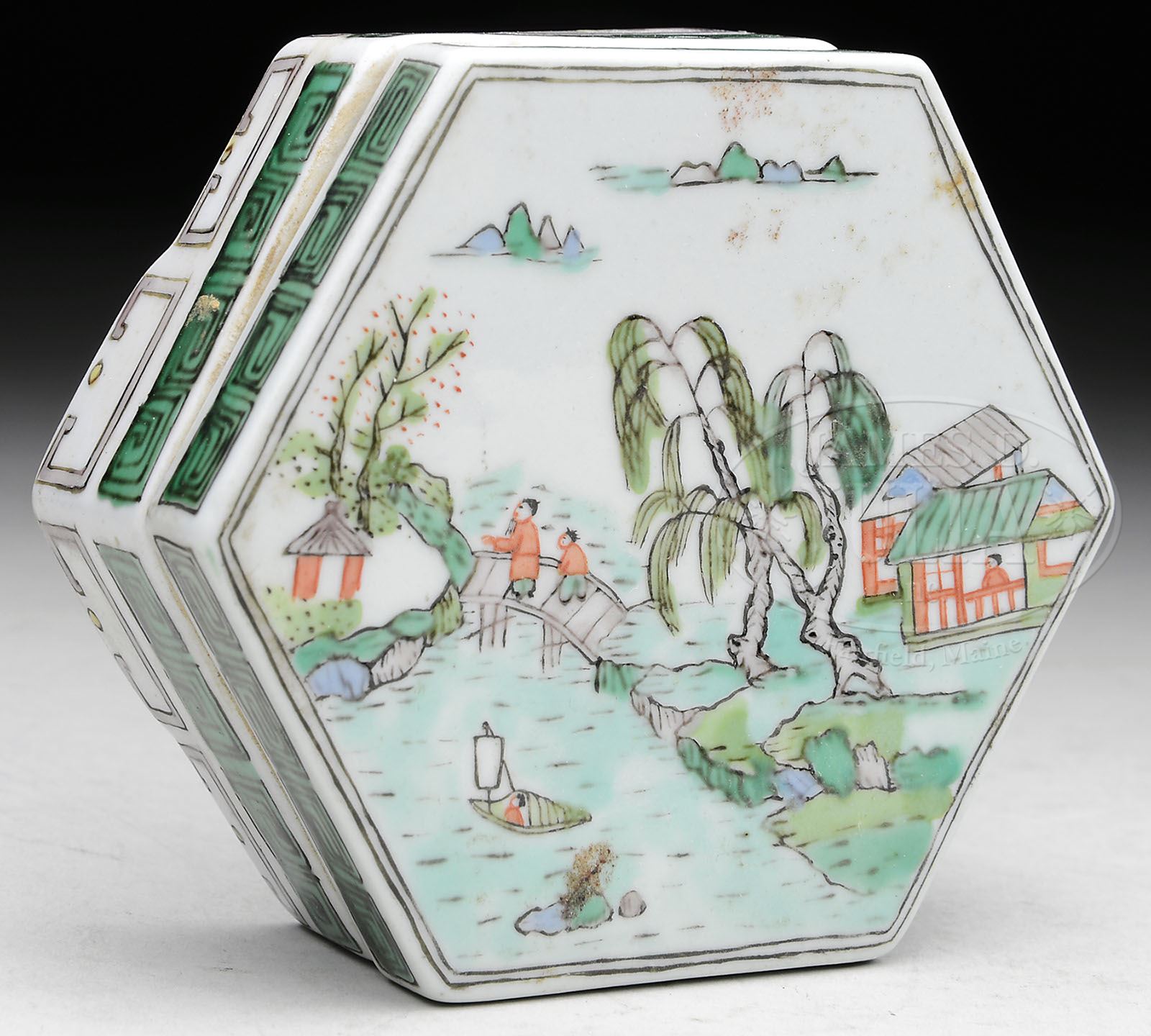 PORCELAIN INCENSE BOX. 19th century, China. Hexagonal famille verte incense box with a landscape motif. SIZE: 3-3/4″ dia. CONDITION: Very good. 7-74349 (200-300)