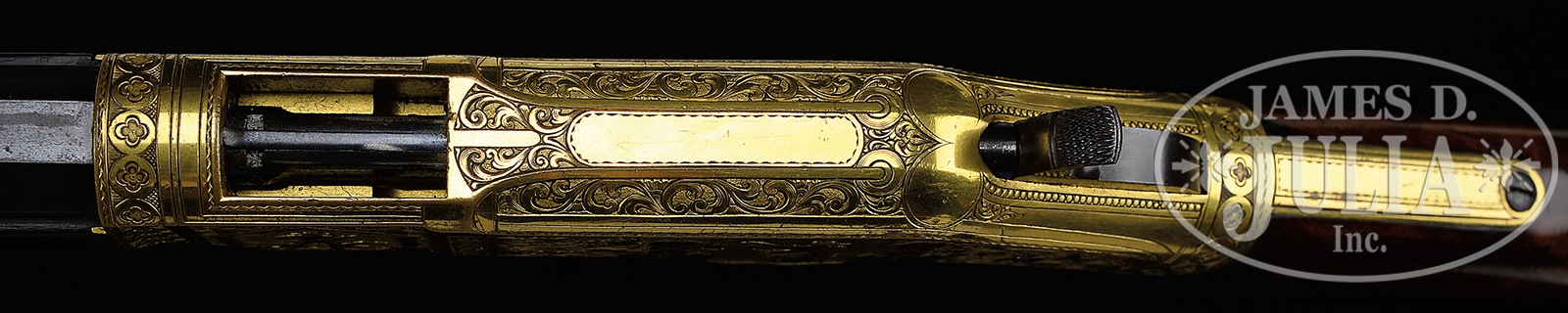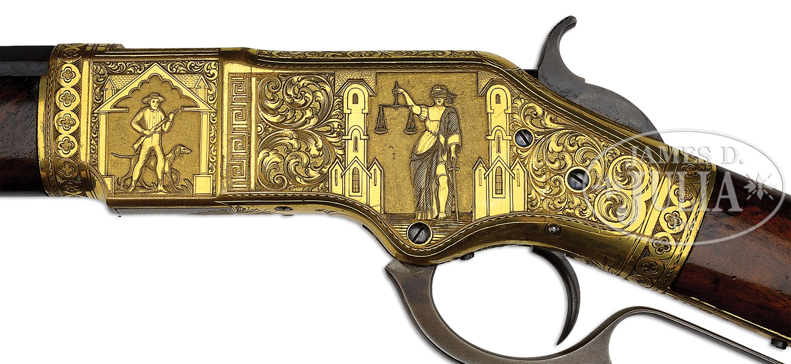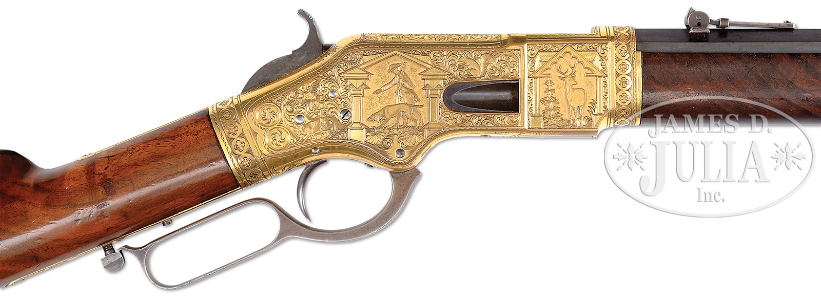 Please Note: In regards to this signed Conrad Ulrich masterpiece. We have just learned that the stock is not the original stock. The original stock was refinished and had average wood. In the last couple of years, it was upgraded with another antique Model 66 rifle stock having great wood and wonderful finish. We understand a number of these truly special engraved Model 66’s have had similar changes. The current stock is outstanding, appropriate and had we not been told and verified this, we would never have been able to determine it. SPECTACULAR HIGH RELIEF ENGRAVED GOLD WINCHESTER MODEL 1866, CONRAD ULRICH SIGNED MASTERPIECE.SN 84015. Cal. 44 RF Henry. Considered to be one of Conrad Ulrich’s masterpieces, this spectacular rifle has a 24-1/4″ oct bbl with Winchester and King’s improvement markings in 2-lines, half-nickel front sight and scarce 900-yard Henry-style ladder rear sight with tension spring mortise in top flat. Gold-plated receiver, buttplate and forend cap. It has highly figured, deluxe burl and flame grain uncheckered straight stock and forearm with crescent buttplate with trap. It has factory sling loops in the forend cap and stock. The receiver, forend cap and buttplate are masterfully engraved in Mr. Ulrich’s now-famous and well-known patterns. The receiver has deep relief vignettes of blind justice holding the sword and scales of justice in between 2 buildings. The front flat on the left side, also in deep relief, depicts a very detailed hunter holding a gun with his dog in the background in a Greek-style arch with a tiled roof building in the background. The right side, also in deep relief, has a vignette of a hunter with his dog holding a gun and directing the dog. The front flat on the right, also in deep relief, pictures a standing stag in foliate and floral setting. The left side vignettes are surrounded with beautifully executed foliate arabesque patterns and a Greek key motif, which divides the 2 panels. The front and rear edges of the receiver have Ulrich’s beautiful four-petal flowers in a chain completely around the circumference. The rear edge of the left flat has 2 small pinwheels. The right side vignettes are also surrounded by foliate arabesque patterns with a fox, a duck and a squirrel concealed within the engraving. The hunter and dog have foliate and floral foreground and the 2 pinwheels appear opposite the left side. The top of the receiver in back of the ejection port, is executed in three panels of fine foliate arabesque engraving with the center blank for effect or for an inscription. The bottom of the receiver is lightly engraved with a split foliate spray divided between the carrier and floorplate. A fine line is engraved around the lever and trigger openings with a spray of foliate engraving back of the trigger. The top tang has simple borders with a space in the middle. The bottom tang has a simple line border with foliate arabesque engraving around the rear screw hole. The buttplate tang is engraved with an outline of foliate arabesque patterns and a plain center. The forend cap has a circle of four-petal flowers that matches those on the receiver. All of the work has Mr. Ulrich’s fine, detailed wavy borders and extremely fine punch-dot background. The vignettes have a plain background which wonderfully offsets the relief decorative work on the figures. The lower tang has Ulrich’s stamped signature in 2 rectangular cartouches rear of SN. This rifle is pictured in full color, both sides, on page 113 of “Winchester Engraving”, 1975, by R. L. Wilson. This is among the handful of truly spectacular relief carved Winchesters known. PROVENANCE: William Sisney Collection; Norm Vegely Collection. CONDITION: Extremely fine. All matching and orig. Matching SN found in upper channel of buttstock and a script “6” on upper left tang. Bbl retains about 95% finish, turning plum on the top half with the sheltered areas having bright original blue. There are 2 or 3 small spots of moderate pinprick pitting with some scattered staining and light pitting on the right flat. The magazine tube is mostly a plum/blue with 3 spots of pitting. The receiver and forend cap retain about 96-97% of their beautiful bright gold plating with the exposed areas a dark mustard brass patina that blends very well. The buttplate retains about 75-80% original gold plating with the balance a dark mustard patina. The wood is sound and retains most of it’s high polish varnish. Mechanically excellent with crisp bright bore. 50412-12 (250,000-500,000) – Lot 4024