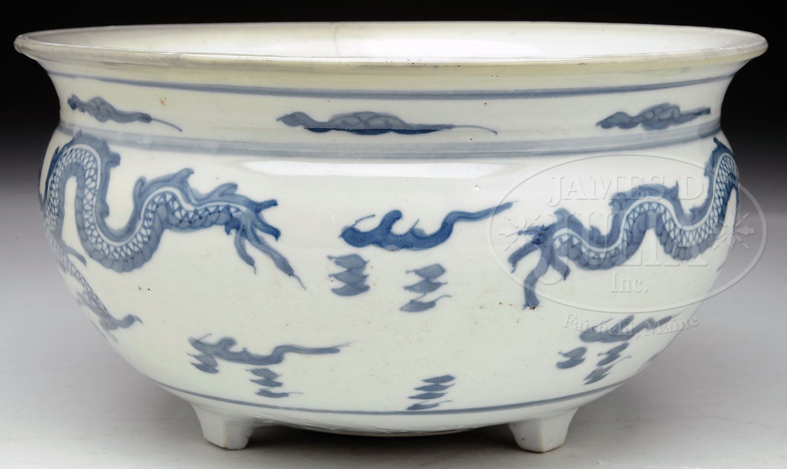 PORCELAIN CENSER. 19th century, China. Dragon decoration in underglaze blue. SIZE: 5″ h x 9-3/4″ dia. CONDITION: Hairline crack, otherwise very good. 7-74382 (200-300)