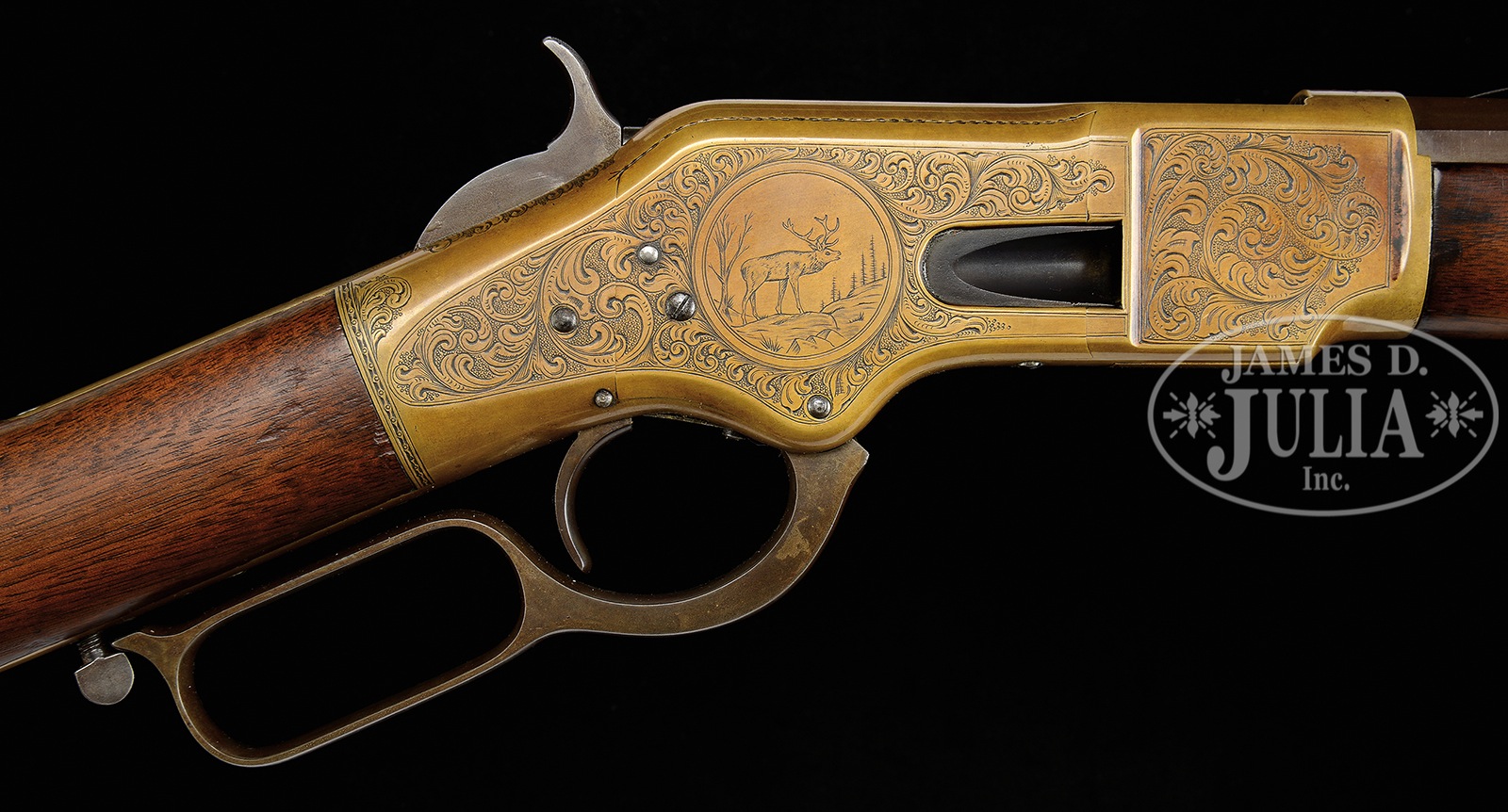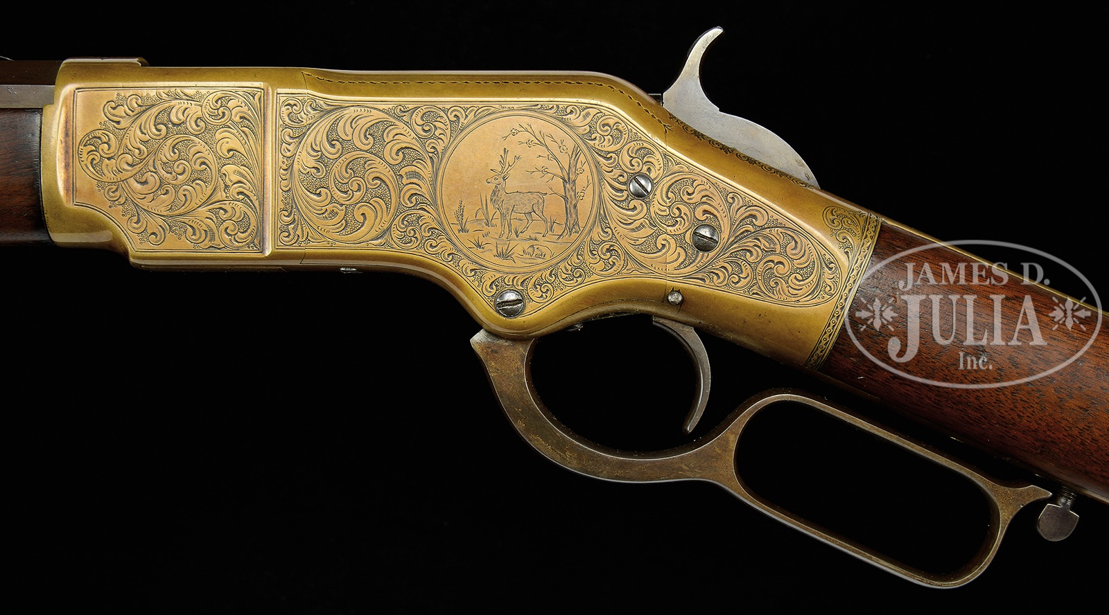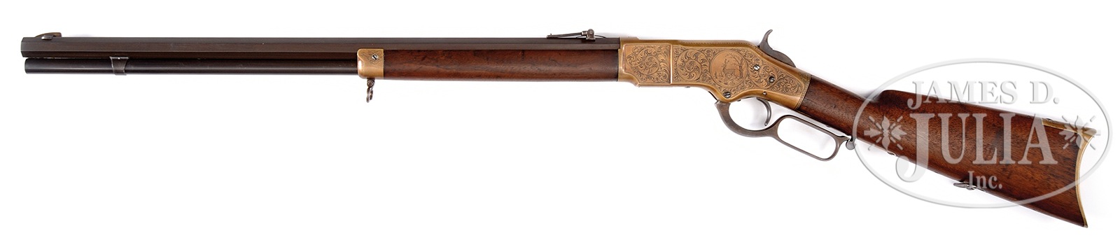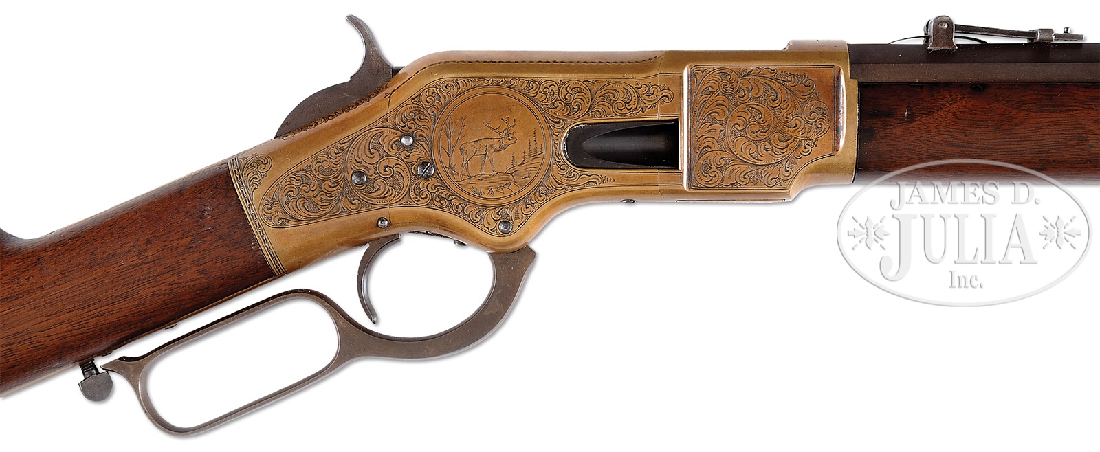 ENGRAVED WINCHESTER THIRD MODEL 1866 OCTAGON BBL FULL MAGAZINE RIFLE.SN 129765. Cal. 44RF. 24″ oct bbl. Full magazine. Blue finish gun metal receiver. Straight grain American walnut stocks with crescent butt and sling swivels attached. Receiver buttplate and tang are all finely engraved in a scroll style with punch dot background. Left sideplate of receiver shows a standing deer in a circular vignette, surrounded by expertly executed leafy scroll work motif with a 2-line border. Right sideplate shows a vignette of a bugling elk with a rnd border and the same scroll work. Forward sides of the receiver also shows leafy scroll work with a 2-line border. Top of receiver shows a starburst in front of ejector port and leafy scroll to rear. Engraved hammer. Elevator is engraved with a checkerboard pattern with dots and line border with a scroll accent to rear. Forend cap has scroll accent around screw. Bbl shows 2-line Winchester address in front of sight. Rocky Mountain brass blade front sight and ladder rear-sight. Receiver has SN stamped on lower tang behind trigger. “R” is stamped on lower tang of left side under stock. Upper tang mortise of buttstock has the last 4-digits of SN stamped. Buttplate has the last 4-digits of SN stamped inside of toe. 4-pc steel cleaning rod in butt. CONDITION: Fine, as refinished. Bbl and magazine tube smooth plumb-brown patina overall with very few small handling marks. Bbl address is readable but faint. Sights are very good. Bore is dark with strong rifling. Receiver has been polished overall, before engraving, and has been patinated to a mustard-brown patina. Engraving is sharp and crisp. Loading gate shows traces of blue. Loading gate shows some traces of blue. Hammer and lever smooth plumb-brown patina. Stocks are very good, slightly undersized, with light handling marks under a light varnish finish. Buttplate shows a mustard patinated finished overall. Sling swivels are good. Forend cap is also a mustard patinated finish. 50506-40 TEP (20,000-30,000) – Lot 4028B Click here to view provenance
