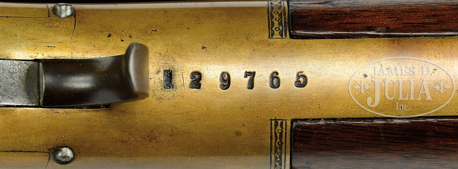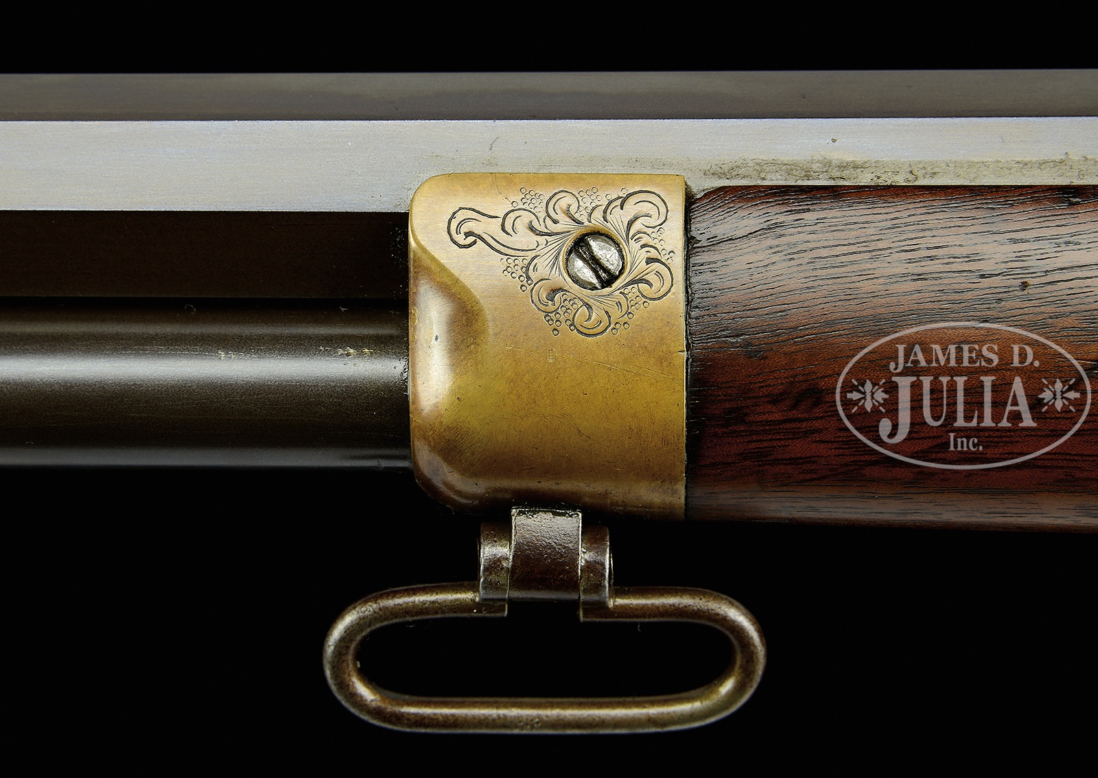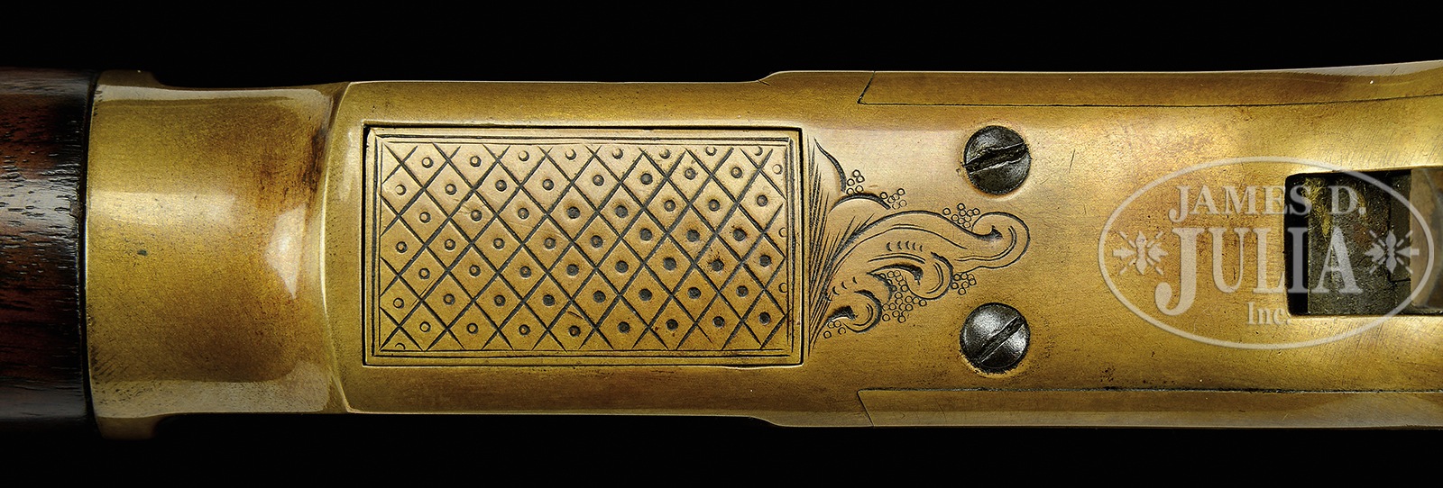 ENGRAVED WINCHESTER THIRD MODEL 1866 OCTAGON BBL FULL MAGAZINE RIFLE.SN 129765. Cal. 44RF. 24″ oct bbl. Full magazine. Blue finish gun metal receiver. Straight grain American walnut stocks with crescent butt and sling swivels attached. Receiver buttplate and tang are all finely engraved in a scroll style with punch dot background. Left sideplate of receiver shows a standing deer in a circular vignette, surrounded by expertly executed leafy scroll work motif with a 2-line border. Right sideplate shows a vignette of a bugling elk with a rnd border and the same scroll work. Forward sides of the receiver also shows leafy scroll work with a 2-line border. Top of receiver shows a starburst in front of ejector port and leafy scroll to rear. Engraved hammer. Elevator is engraved with a checkerboard pattern with dots and line border with a scroll accent to rear. Forend cap has scroll accent around screw. Bbl shows 2-line Winchester address in front of sight. Rocky Mountain brass blade front sight and ladder rear-sight. Receiver has SN stamped on lower tang behind trigger. “R” is stamped on lower tang of left side under stock. Upper tang mortise of buttstock has the last 4-digits of SN stamped. Buttplate has the last 4-digits of SN stamped inside of toe. 4-pc steel cleaning rod in butt. CONDITION: Fine, as refinished. Bbl and magazine tube smooth plumb-brown patina overall with very few small handling marks. Bbl address is readable but faint. Sights are very good. Bore is dark with strong rifling. Receiver has been polished overall, before engraving, and has been patinated to a mustard-brown patina. Engraving is sharp and crisp. Loading gate shows traces of blue. Loading gate shows some traces of blue. Hammer and lever smooth plumb-brown patina. Stocks are very good, slightly undersized, with light handling marks under a light varnish finish. Buttplate shows a mustard patinated finished overall. Sling swivels are good. Forend cap is also a mustard patinated finish. 50506-40 TEP (20,000-30,000) – Lot 4028B Click here to view provenance