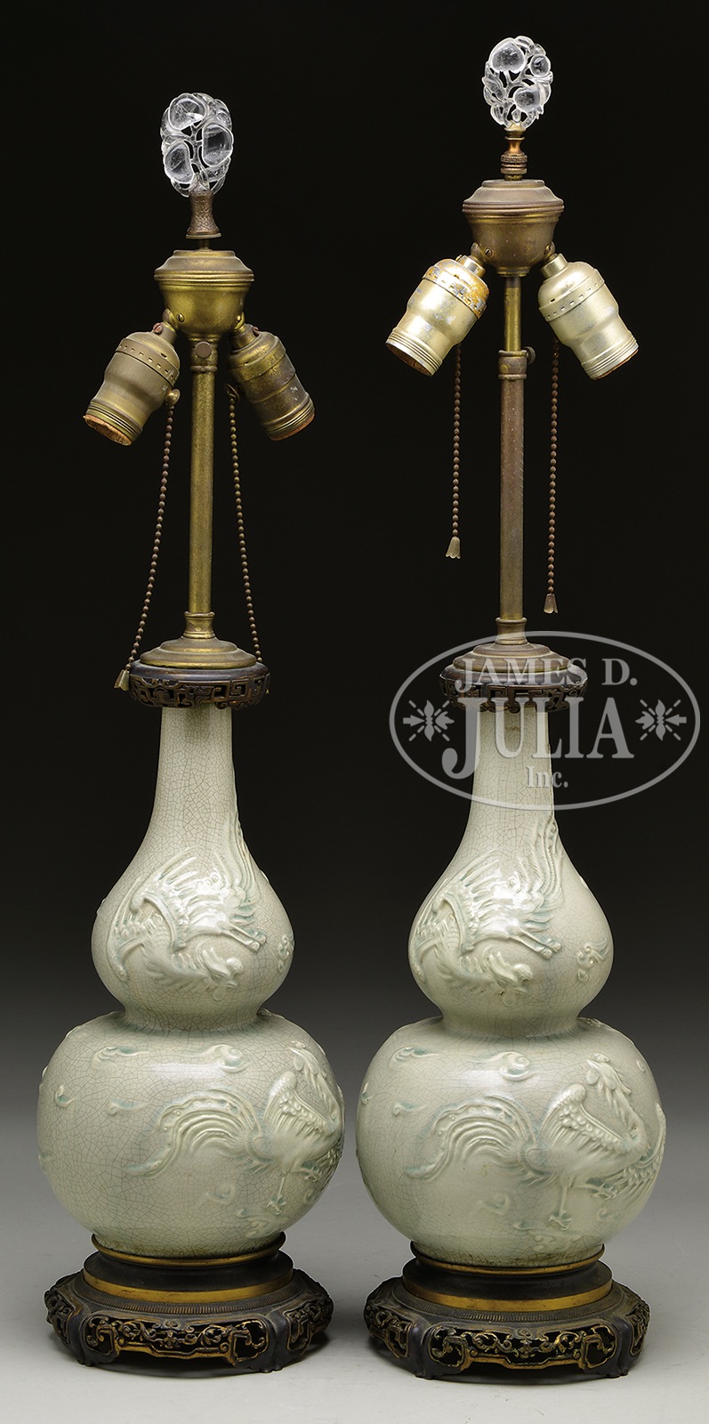 PAIR OF DOUBLE GOURD PORCELAIN VASES.Late 19th China. Each with relief decoration of phoenixes and flowers. Pale celadon glaze. With crystal finials. SIZE: Overall is 28″ h. CONDITION: Drilled and mounted as lamps. 9-93497 (800-1,200) – Lot 4030