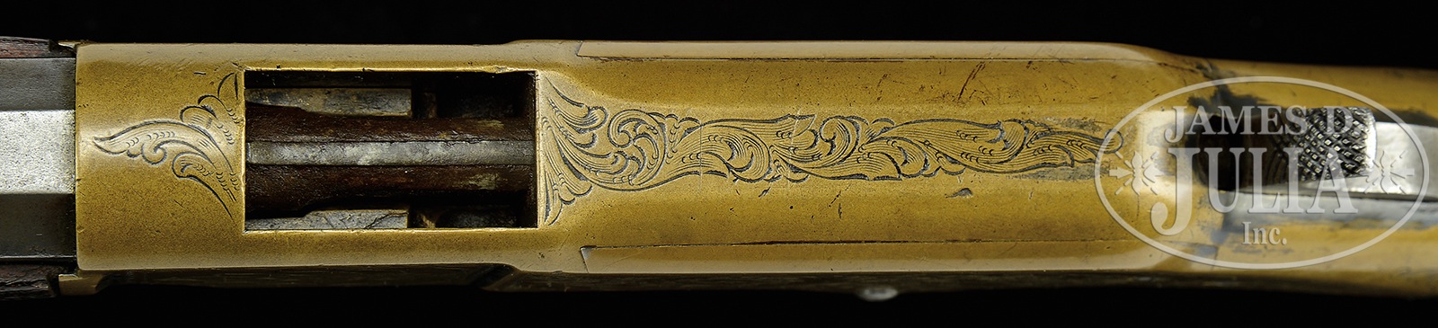 FACTORY ENGRAVED WINCHESTER SECOND MODEL 1866 OCTAGON BARREL RIFLE WITH SILVER PRESENTATION PLAQUE.SN 18409. Cal. 44RF. 24″ oct bbl. Full magazine. Blue and silver finish. Gun metal receiver with nicely figured American walnut stocks. Crescent buttplate with sling swivel attached. Forward swivel is missing. Receiver engraving is of a leafy scroll motif with floral accents. Forward flats of receiver have a grape-leaf motif. Top of receiver has scrolled accents in front of ejector port with leafy scroll to rear toward hammer. Top tang also has leafy scroll work. Engraving has dbl line border all around. Bottom of receiver is plain. Buttplate has leafy scroll accent on tang around screw leading to heel. Forend cap also has scroll accent around both screws. Listed as one of a few engraved like Henry rifles as per R. L. Wilson p. 66 in “The Book of Winchester Engraving” 2nd Edition. Bbl shows a 2-line Henry’s and King’s patent mark. German silver blade front-sight, ladder rear-sight. SN is stamped on lower tang under lever. SN is also stamped in upper tang mortise of buttstock. Buttstock has nicely figured wood, especially on right side. Right side of buttstock has a period of use rectangular silver presentation plaque with dished out corners inlet into the stock. Plaque reads, “Presented to THOs McMullen by his friends in Des Moines, August 13, 1870.” CONDITION: Very good. Bbl and magazine tube are a silver-gray-brown patina overall with high point wear and some small dents. Bbl mark is legible but light. Sights are very good. Bore is dark with strong rifling. Muzzle of bbl has been lightly dressed. Receiver is a mustard-brown patina overall with traces of deeply patinated silver finish around hammer in gullets in forward portion of frame and around trigger. Engraving is sharp and unpolished. Receiver has light scratches and a few small dents overall. Lower tang has been repaired using an over-lapping joint that has been braised and screwed together. SNs have been properly re-stamped. Stocks are very good, slightly under-sized with a dark brown finish overall. Stocks have numerous handling marks and dents. Forend shows numerous handling marks and dents, with a chip missing on upper front left side. Presentation plaque is very good. 50506-37 TEP (17,500-27,500) – Lot 4030 Click here to view provenance
