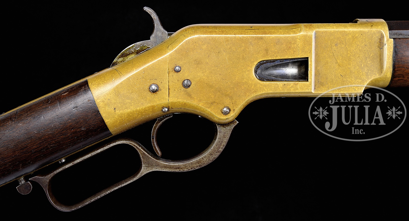 SN 156257. Cal. 44RF. 24″ oct bbl. Full magazine. Straight grain American walnut stocks with steel crescent buttplate. Bbl shows 2-line Winchester address in front of rear-sight, silver blade front-sight and semi-buckhorn rear-sight. Bbl has no cal mark. Gun metal receiver has SN engraved on lower tang behind lever, with “O” inspector mark under lever. Assembly no. “2293” is stamped on lower tang left side under stock. Assembly no. “2293” is also stamped in upper tang mortise of buttstock and on inside toe of steel buttplate. CONDITION: Fine. Bbl retains 50% blue that is drifting to a plumb-brown patina, with some staining toward the muzzle. Magazine tube is a plumb-brown patina overall. Bbl address is sharp. Bore is dark with visible rifling. Receiver has an even mottled mustard-brown patina overall with sharp edges and only small scratches on sides. Loading gate shows traces of fire-blue. Elevator has no dents. Tang marking is sharp. Hammer shows slight traces of case color. Lever also shows light traces of case color. SN is clear and sharp. Stocks are very good and full-sized and retain much of orig varnish finish. Stocks have handling marks and bruises overall. Forestock shows scratches on both sides. Buttplate is a gray-brown patina overall with very slight traces of case color on tang. Heel and toe show some erosion. Forend cap is a smooth gray-brown patina. 50843-4 TEP (10,000-15,000) – Lot 4036