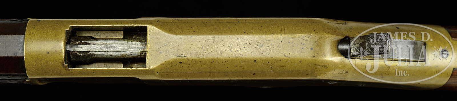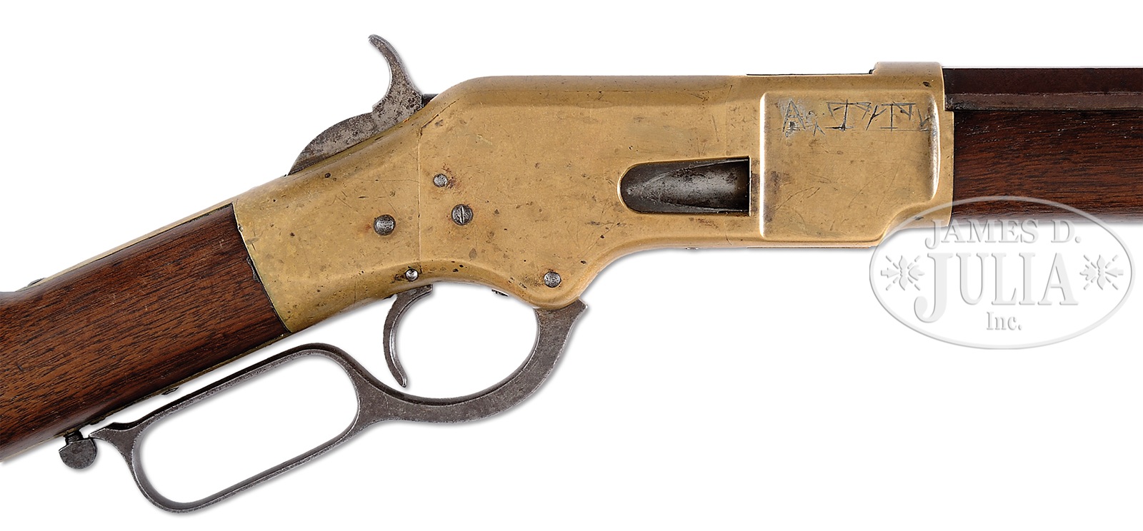 SN 150003. Cal. 44RF. 30″ half rnd half oct bbl. Blue finish. Gun metal receiver. Straight grain American walnut stocks with crescent butt. Bbl shows standard 2-line address stamped in front of rear-sight. Standard blade front-sight, semi-buck-horn rear-sight. Half rnd half oct special order 30″ bbl. Full magazine. Gun metal receiver has SN stamped on lower tang behind lever. Upper tang has been tapped for sight. Right forward side of receiver has initials carved. There are very minute traces of silver plate near these initials at front of frame.Initials are hard to decipher. Appear to be “A.T.T.”. There are also some traces of silver finish on inside of tangs. Lower tang has “87” and “1448” stamped on left side. Assembly no. “87” also appears in upper tang mortise of stock and on inside toe of buttplate. Forearm has steel forend cap. Receiver was originally of the Carbine type and has the saddle ring staple holes plugged. Accompanied by a Cody Firearms Museum letter dated February 19, 1997 confirming bbl length and configuration and showing shipment on October 10, 1878. Order no. 13359. CONDITION: Very good. Bbl is a smooth plumb-brown patina overall with sharp address. Oct section has some small dents on the high points on either side of the address. Bbl and magazine tube show some slight staining toward the muzzle end. Sights are very good. Bore is dark with strong rifling. Receiver is a mustard-brown patina overall with numerous scratches and dents on either side, and on the bottom in front of lever. Lower tang is broken at the lever latch. Hammer and lever are a gray-brown patina with slight traces of silvered out case color. Stocks are very good, full-sized, with handling marks overall and some larger dents toward the toe of butt. Buttplate is a mustard-brown patina with some scratching and staining on rear portion. Forend has some denting on either side. Steel forend cap is a gray-brown patina. A chance to purchase an extremely rare Long Barrel Winchester Model 66 rifle in a very rare configuration. 50506-42 TEP (6,000-10,000) – Lot 4041