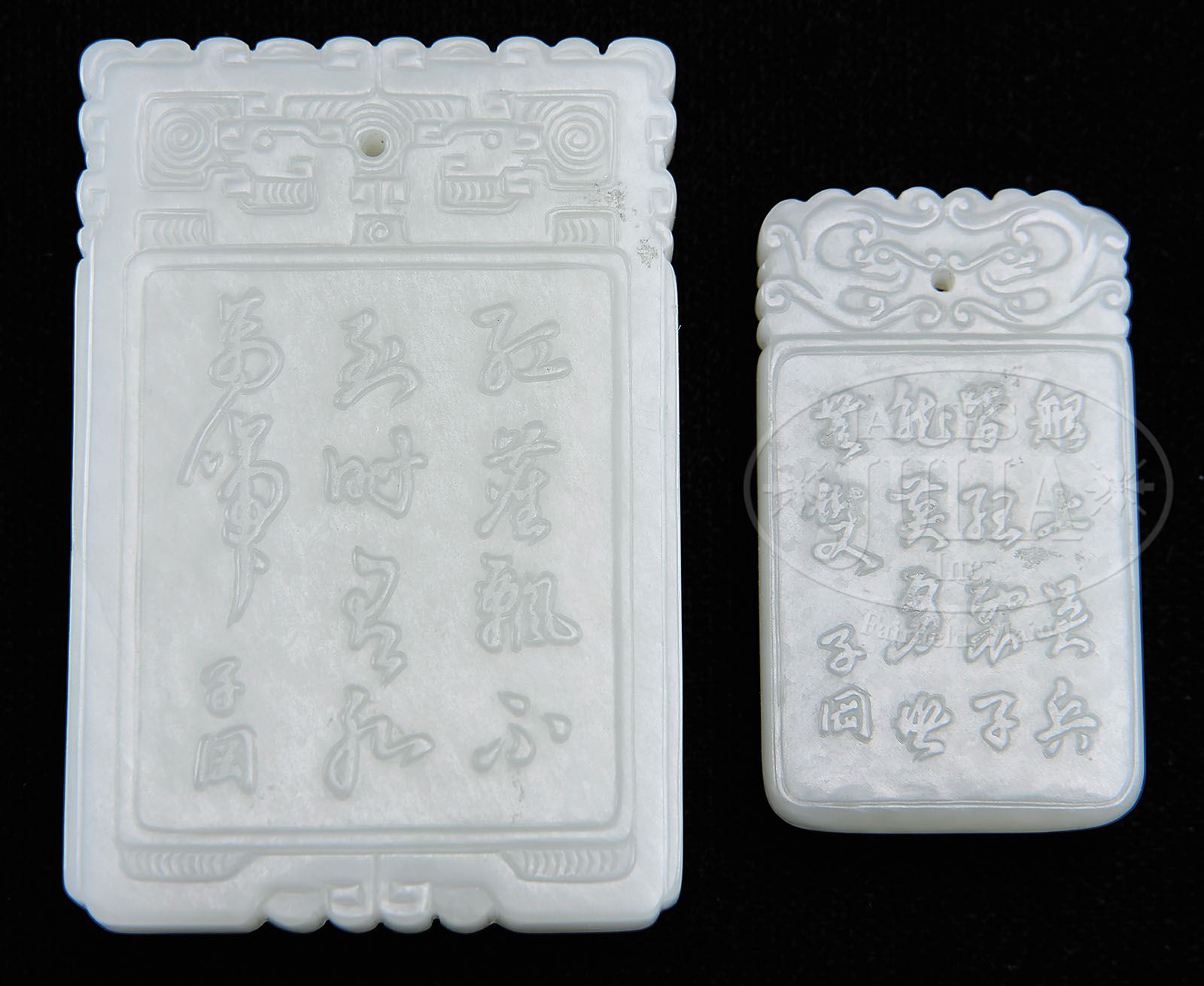 TWO JADE PLAQUES. 19th/20th century, China. Rectangular form. Grey white stone, one has a farming scene on the front and a poem on the reverse, the other has a warrior and a poem on the reverse. SIZE: 1-7/8″ l and 2-5/8″ l. CONDITION: Very good. 9-91053 (500-700)