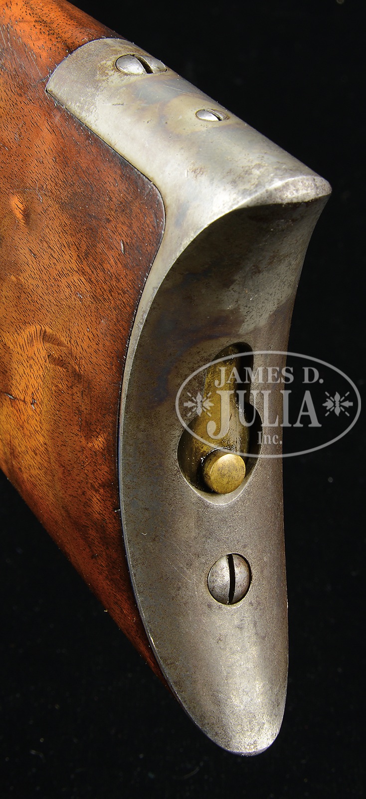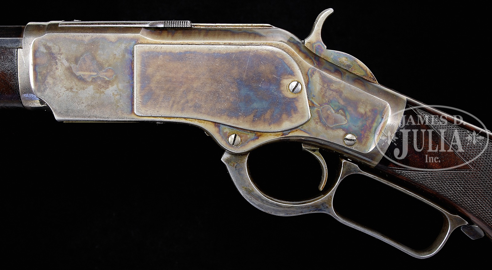 WINCHESTER THIRD MODEL 1873 DELUXE RIFLE WITH HALF ROUND BARREL, BUTTON MAGAZINE, AND CRESCENT BUTTPLATE.SN 107940. Cal. 38 WCF. 24″ half rnd bbl. Button magazine. Receiver is of stepped variety. Nicely figured American walnut stocks with checkered pistol grip and forearm. Crescent buttplate. Bbl with correct 2-line address. Cal marking on top flat at breech. German silver front-sight, semi buckhorn rear-sight. Receiver shows Model 1873 with finials on upper tang. SN is stamped on lower tang behind lever latch. There is an “A” stamped under SN. Assembly no. “4567” is stamped on left side of tang under stock. Tang is also marked “XX” and “R”. Upper tang mortise of buttstock also shows assembly no. “4567” with “38” stamped in front. Buttplate has “4567” stamped on inside of toe with “O” inspector mark above. “RH” is stamped in stock under tang of buttplate. Accompanied by a Cody Firearms Museum letter dated August 24, 1981 confirming all features of this rifle and showing shipment on April 7, 1883. CONDITION: Very fine. Bbl retains 70% blue finish, that is drifting to a plumb-brown patina with some slight scratches. Bbl marks are sharp. Bore is frosty with strong rifling. Receiver retains 80% case color that is vivid in protected areas, with a few light scratches. Tang marks are sharp. Dust cover shows 50% blue, blending to a plumb-brown patina. Loading gate shows a considerable amount of fire-blue. Elevator is a mottled mustard-brown patina with a clear mark. Hammer shows 90% case color on both sides and rear, with some slight scratch marks on side with sharp checkering. Lever shows generous amounts of color especially towards hinge. Stocks are fine and retain nearly all the varnish finish, with some light handling marks overall. Checkering is sharp. Buttplate shows 20% case color on tang, with the balance a silver-gray patina and slight roughness at the heel. Forend cap shows 20% case color that is blending to a smooth silver-gray patina. 50506-3 TEP (20,000-30,000) – Lot 4049 Click here to view provenance