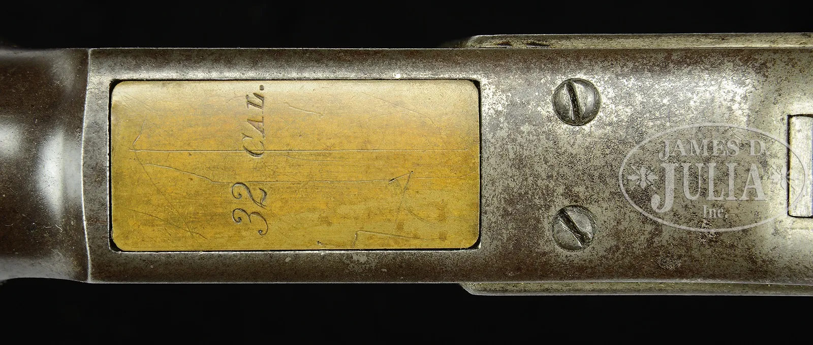 EXTREMELY RARE AND DESIRABLE WINCHESTER THIRD MODEL 1873 DELUXE RIFLE WITH 36″ BARREL, FULL MAGAZINE, CASE COLORED RECEIVER, SET TRIGGER, CHECKERED HIGHLY FIGURED AMERICAN STOCKS WITH CRESCENT BUTTPLATE.SN 424364. Cal. 32 WCF. 36″ oct bbl. Full magazine. Blue and case color finish. Lyman sights. Set trigger. Receiver is of stepped variety. Fancy checkered American walnut stocks with pistol grip and ebony insert. Crescent buttplate. Bbl shows standard 2-line Winchester address with cal mark at breech-end. Lyman front-sight, sporting rear-sight, and Lyman tang sight. Receiver has SN stamped on lower tang behind lever latch. Tang sight was not removed. Top tang screw is marred and prevents stock removal. Tang sight was not removed. Elevator is marked “32 CAL”. Inside toe of buttplate has assembly no. “722” with inspector “O” stamped above. Accompanying this rifle is a Cody Firearms Museum Letter dated October 23, 1997, confirming cal, bbl length, set trigger, checkered stock, pistol grip, Lyman sights, and case hardened receiver. Letter shows shipment on October 27, 1892. Order number 8487. Also included is a copy of a page from an auction catalog when this rifle was sold in 1997, and a page from the Winchester Ledger Book listing this rifle. CONDITION: Very good. Bbl and magazine tube show a plumb-brown finish overall, with some dark stains and a couple of small scratches. Bbl markings are sharp. Bore is dark with visible rifling. Receiver has a silver-gray patina overall with some traces of case color and some slight staining. SN mark is sharp. Elevator shows a deep plumb-brown patina and clear SN mark with some light scratching. Hammer shows some traces of case color on back side, with the balance a smooth brown patina. Lever also shows a smooth brown-patina. Set trigger needs adjustment. Set trigger screw is broken. Lyman tang sight is good. Stocks are very good, full-sized, with nice figure on both sides and appear orig to this rifle. Buttplate fits with proud wood on all sides. Stocks retain a considerable amount of varnish finish with handling marks and dents overall. Checkering is slightly worn at pistol grip and well worn at forend. Buttplate is a smooth gray-brown patina with slight roughness at heel. Forend cap is a smooth gray-brown patina. 50506-27 TEP (15,000-25,000) – Lot 4054 Click here to view provenance