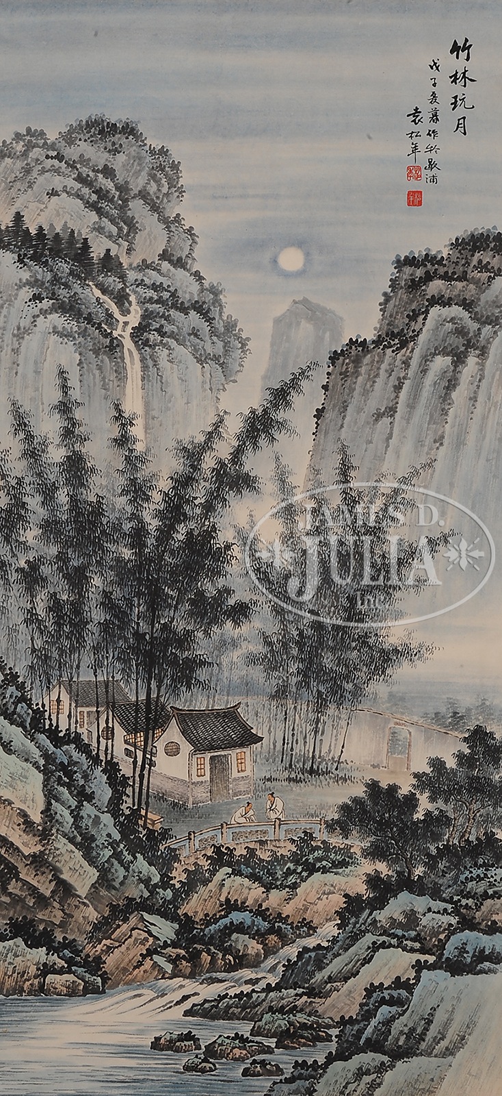 THREE PAINTING ITEMS: ONE HANGING SCROLL & TWO LOOSE PAINTINGS.China, ink and colors on paper, a hanging scroll depicting Li River, in the attributed to Zhang Yuan, inscribed, dated guiyou year, with four seals; a loose painting attributed to Huang Binhong, depicting cottages and mountains, dated jichou year, signed, with one seal; a loose painting attributed to Yuan Songnian, depicting two recluses appreciating moon in front of a pavilion in an evening landscape, inscribed, dated spring of wuzi year, signed “Yuan Songnian,” with two seals. SIZE: 40 ¼” x 20”, 15” x 9” , 38” x 17 ½” CONDITION: All in good condition. 9-93933 (1,000-2,000) – Lot 4055