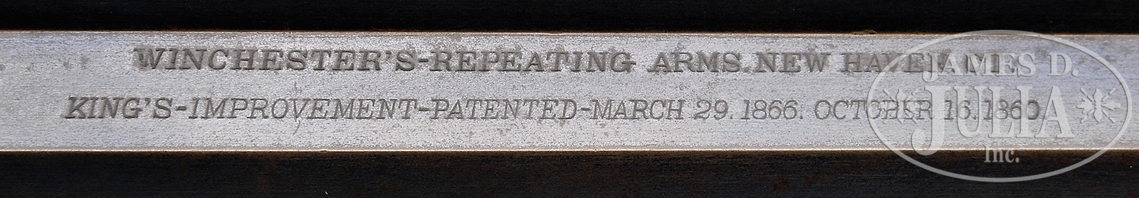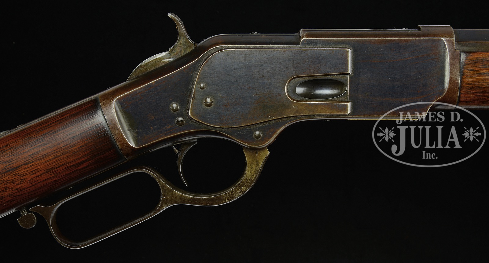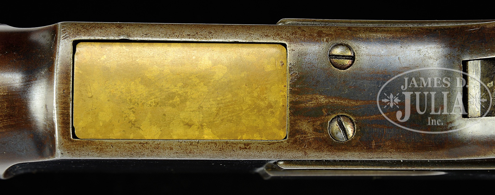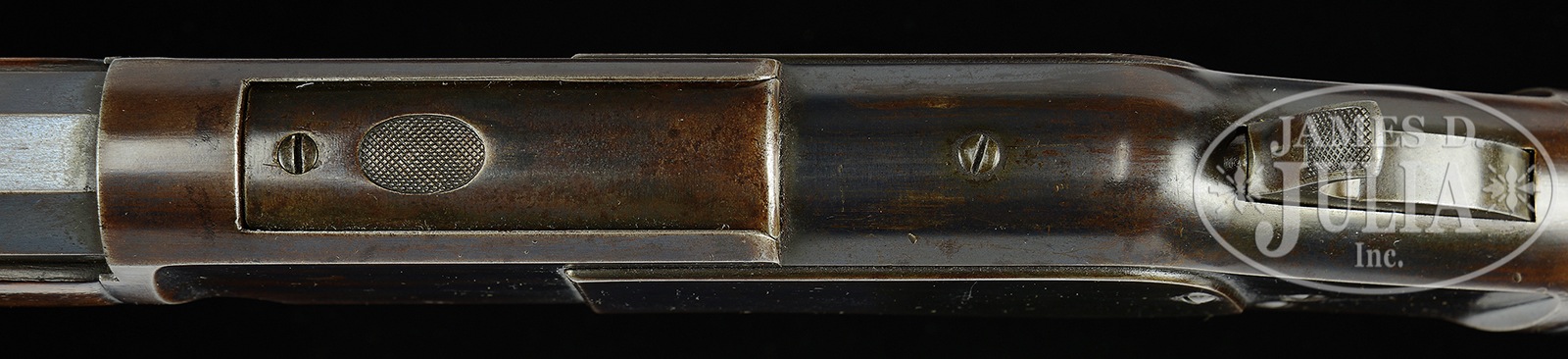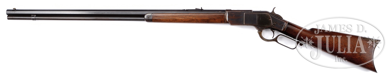RARE AND DESIRABLE WINCHESTER FIRST MODEL 1873 RIFLE WITH 30″ OCTAGON BARREL AND SINGLE SET TRIGGER.SN 23422. Cal. 44 WCF. 30″ oct bbl. Full magazine. Blue finish. Straight grain American walnut stocks with crescent butt. Bbl shows correct 2-line Winchester address rolled in front of rear-sight. German silver blade front-sight and sporting rear-sight. Magazine hanger mortise measures 3-3/4″ of the muzzle. Receiver is of the first model type with dust cover riding in mortise. No guide rail. Dust cover has checkered 5/8″ oval thumbprint. Left side of lower tang shows assembly no. “1805”. Upper tang mortise of buttstock also shows assembly no. “1805” as does inside toe of buttplate. Accompanying this rifle is a Cody Firearms Records office Letter dated August 5, 2016, confirming the bbl length, and the set trigger and showing shipment on October 9, 1876. Order number 7310. CONDITION: Fine, for this model. Bbl and magazine tube shows 50-60% blue finish, blending with a smooth plumb-brown patina with some high point and muzzle wear. Bbl address is sharp. Bore is dark with strong rifling. Receiver shows 40% blue finish overall, blending with a smooth brown patina. Left sideplate has some touch up on rear portion. Receiver shows striation marks and light scratching overall. Dust cover shows traces of blue with the balance a smooth plumb-brown patina. Checkering is sharp. Loading gate shows generous traces of blue. Elevator is a mottled mustard-brown patina. Tang marks are sharp. Lower tang slightly over-hangs receiver. Set trigger functions. Hammer shows generous traces of case color with balance a plumb-brown patina, with a slight scratch on right side. Lever is also a smooth gray-brown patina with some staining. Stocks are very good, slightly under-sized and show and old varnish finish with only minuscule handling marks. Buttplate is a mottled brown patina with some roughness at heel. Forend cap shows 30% blue blending with a plumb-brown patina. 50506-1 TEP (12,500-17,500) – Lot 4055 Click here to view provenance