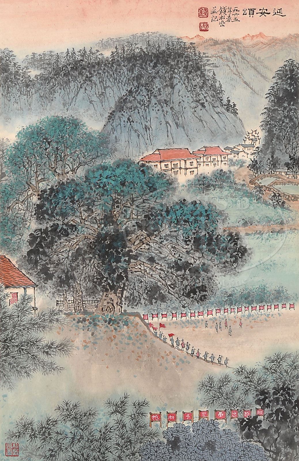 TWO HANGING SCROLLS. China. 1) In the manner of Li Xiongcai, ink and light colors on paper, depicting iris branches growing out of rockery, inscribed, dedicated to Mr. Huasheng, dated 1988, signed “Xiongcai,” with two seals. 2) In the manner of Qian Songyan, ink and colors on paper, depicting revolutionary marches in the field, inscribed “Ode to Yan’an,” signed, dated 1965, with three seals. SIZE: 1) 26-1/2″ x 18-1/4″. 2) 27″ x 17-1/2″. CONDITION: Good. 9-92455 (600-800)
