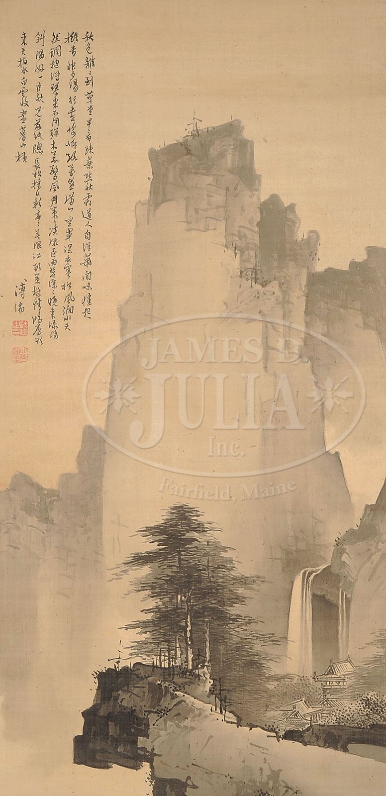HANGING SCROLL ATTRIBUTED TO PU RU (1896-1963). China, ink on silk, depicting pavilions in a rocky landscape with waterfalls and pines, with lengthy inscription, signed “Pu Ru,” with two seals “Pu Ru zhi yin” and “Xinyu han mo”. SIZE: 39-1/2″ x 19″. CONDITION: Good with minor foxing. 9-92453 (600-800)
