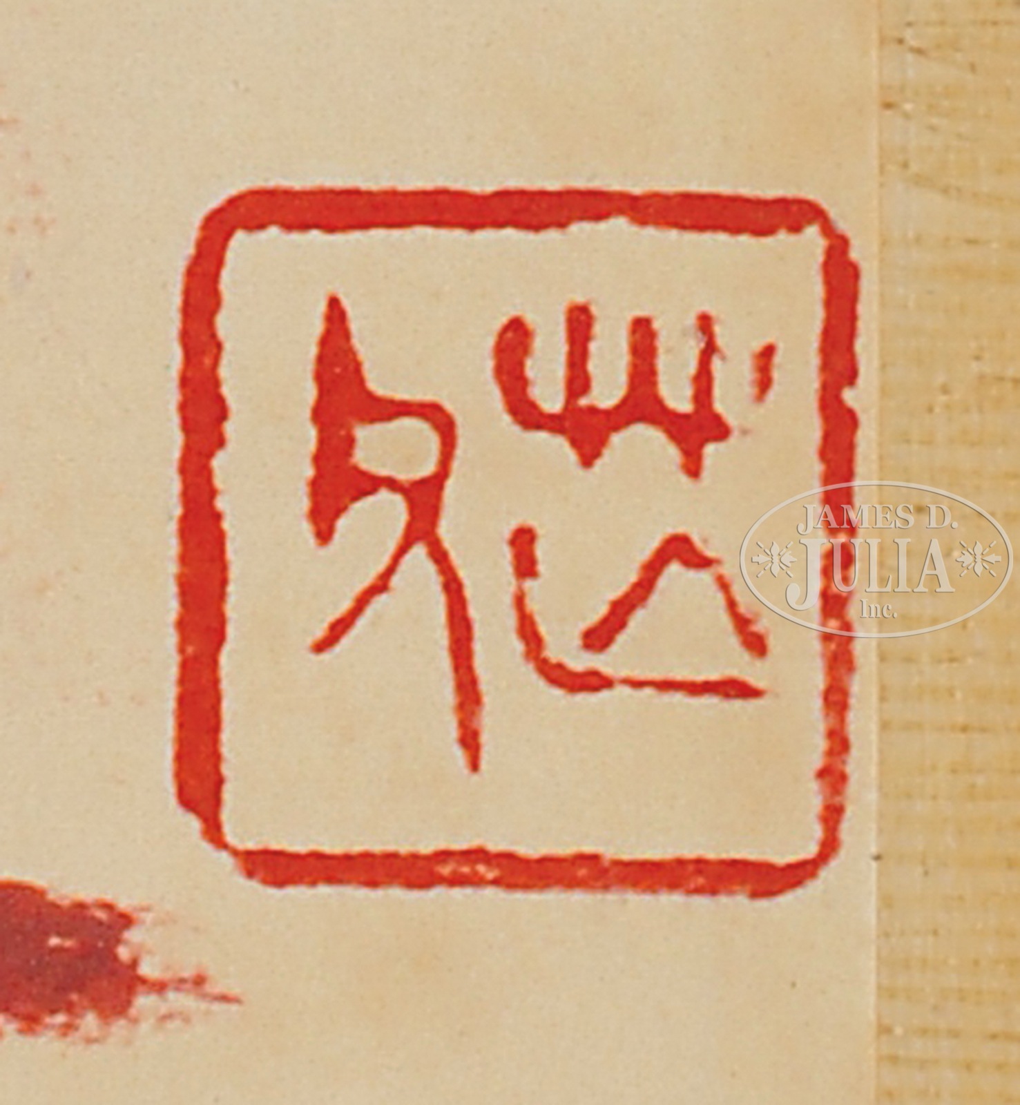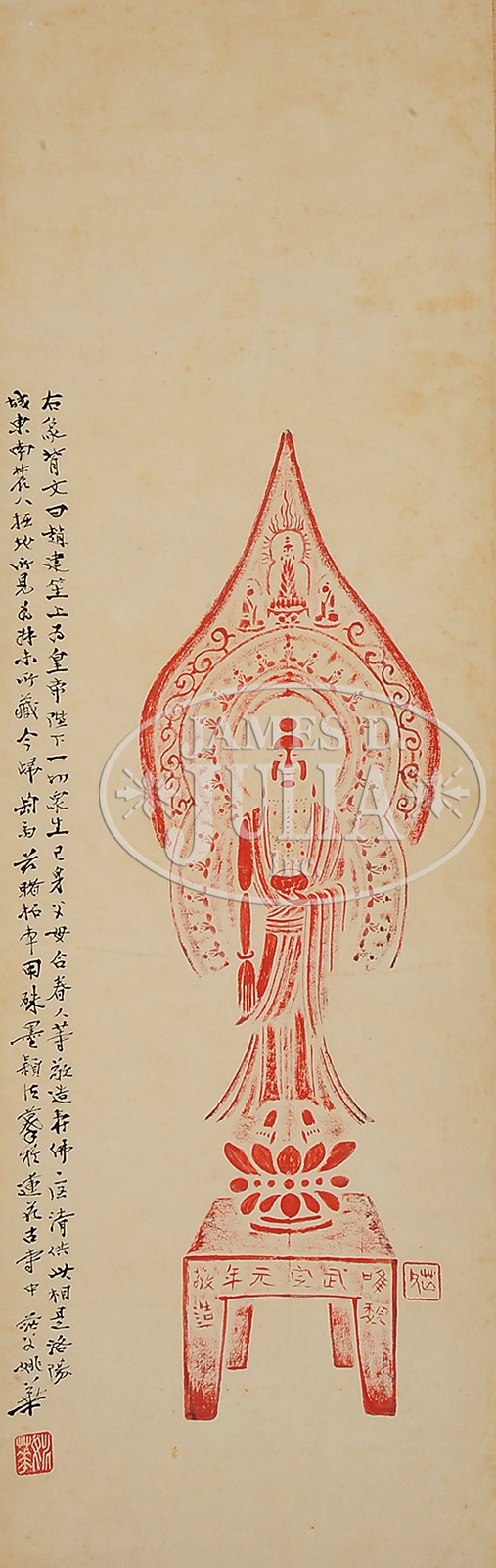 SET OF FOUR HANGING SCROLLS.China, first half of the 20th Century, red ink painting/rubbing on paper, depicting a Buddhist image on a stand, inscribed, signed “Yao Hua”, dated wuchen year, with seals. SIZE: 25″ x 8″. CONDITION: Poor, surface grime. 9-91465 (700-900) – Lot 4068