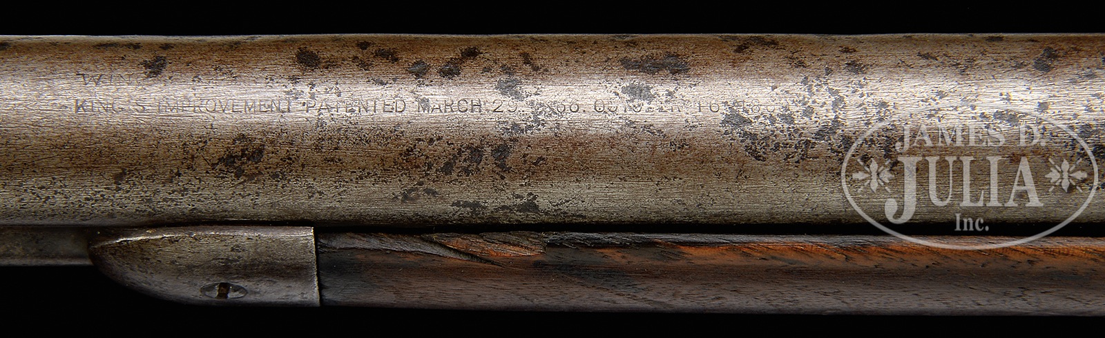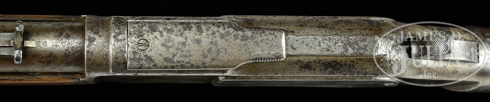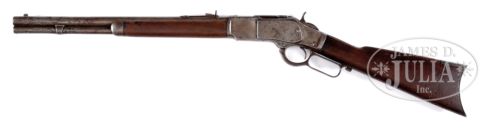 RARE AND DESIRABLE ANTIQUE WINCHESTER THIRD MODEL 1873 ROUND BARREL SHORT RIFLE.SN 509014B. Cal. 44 WCF. 18″ rnd bbl. Full magazine. Blue finish. Receiver is of stepped variety. Straight grained American walnut stocks. Bbl shows remnants of 2-line Winchester address in front of rear-sight with cal mark at breech-end. Upper tang of receiver is marked Model 1873 with finials. SN is stamped on lower tang behind lever latch. Elevator is marked “44 CAL”. Straight grain American walnut buttstock has a crescent buttplate. Forearm is 8-3/8″ long, which is correct. Center of magazine hanger mortise is 3-3/4″. Center of front-sight mortise is 15/16″ from muzzle. Accompanied by a Cody Firearms Museum Letter dated September 26, 2011, confirming cal, bbl length and configuration, and showing shipment on February 11, 1897. Order number 2888. 18″ short rifles are very uncommon as opposed to the traditional 20″ variation. CONDITION: Good, for this type of rifle. Bbl and magazine tube are silver-gray overall with pitting and a partially visible bbl address. Cal mark is clear. Bore is frosty with visible rifling. Rear sight elevator is a replacement. Receiver is also a silver-gray finish with heavy pitting, especially on right side. Upper tang mark is readable. Lower tang serial mark is clear. Elevator is a deep mustard brown patina, with a visible cal mark and some slight dents. Hammer and lever are both a deep silver-gray patina, with some pitting. Stocks are good, under-sized, with heavy handling marks overall, and a small crack behind upper tang on left side. Forearm has chips missing on both sides at forward end. Buttplate is a dark brown patina with pitting on tang. Forend cap is a silver-gray patina with heavy pitting. This is an excellent example of a “Border Model” Winchester short rifle” that without doubt saw extremely heavy service, probably during the Mexican Revolution of 1910. 50506-21 TEP (5,000-8,000) – Lot 4076 Click here to view provenance
