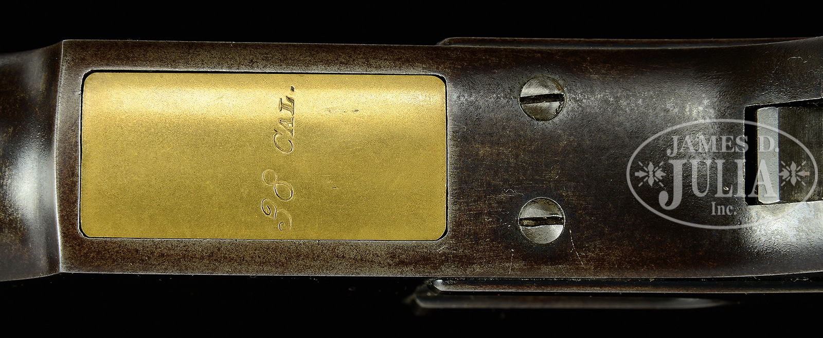 SN 61371. Cal. 38 WCF. 22″ half rnd half oct bbl. German silver blade front sight. Semi buckhorn rear-sight. Winchester 2-line address is rolled in front of rear-sight with cal mark at breech-end. Forend is 8-1/4″ long, which is correct. Receiver is of the stepped variety with dust cover guide-rail screwed to top. Trigger pin is exposed. Upper tang is marked Model 1873 without finials. SN is engraved on lower tang behind lever latch. Elevator is marked “38 CAL”. Lower tang shows assembly no. “61” stamped on left side. Buttstock shows assembly no. “61” in upper tang mortise, with the no. “38” and “P” in front. Buttplate has assembly no. “61” stamped on inside of toe. CONDITION: Very good. Bbl shows a plumb-brown patina overall with traces of blue in protected areas. Bbl markings are sharp. Cal mark is sharp. Bore is bright with strong rifling. Receiver shows a plumb-brown patina overall, with some blue in protected areas and sharp markings. Dust cover is also a plumb-brown patina. Loading gate shows traces of fire-blue. Elevator has been cleaned with a sharp mark. Stocks are very good, slightly under-sized and have been cleaned long ago. Stocks show handling marks overall with a small gouge on lower forend. Buttplate shows 50% blue with balance a plumb-brown patina. Forend cap shows 50% blue with balance a plumb-brown patina. A rare Special Order Winchester Second Model 1873 rifle with a shorter than standard bbl. 50506-23 (7,500-10,000) – Lot 4077