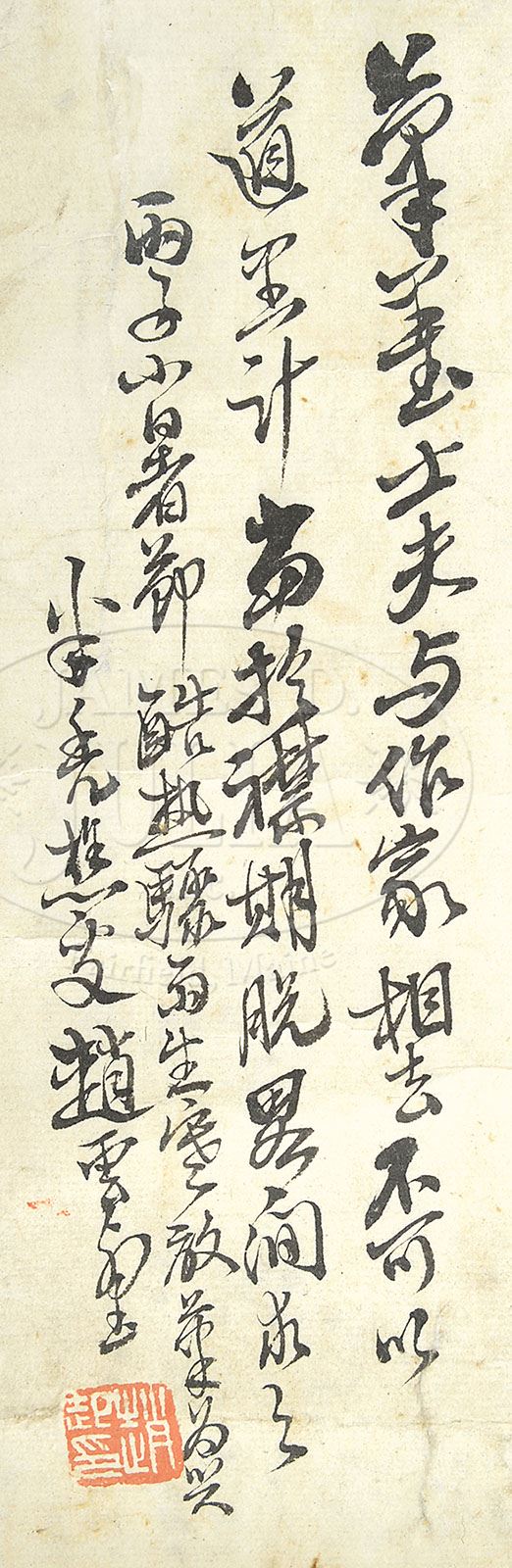 TWO HANGING SCROLLS. China. 1) Attributed to Huang Huanwu (1906-1985), ink and colors on paper, depicting a boatman sailing under willows, dated, signed “Hanseng,” with two seals “Huanwu” and “Huang Huanwu yin,”. 2) In the manner of Zhao Qi, ink and colors on paper, depicting a recluse contemplating under and old pine in a mountainous landscape, inscribed, dated “summer of bingzi year,” signed “Bantu qiaosou Zhao Yunhe,” with two seals. SIZE: 1) 38-1/2″ x 13-1/4″. 2) 27″ x 13-3/4″. CONDITION: 1) Tear to the top mount. 2) Creases, minor stains, without scroll ends. 9-92449 (800-1,000)