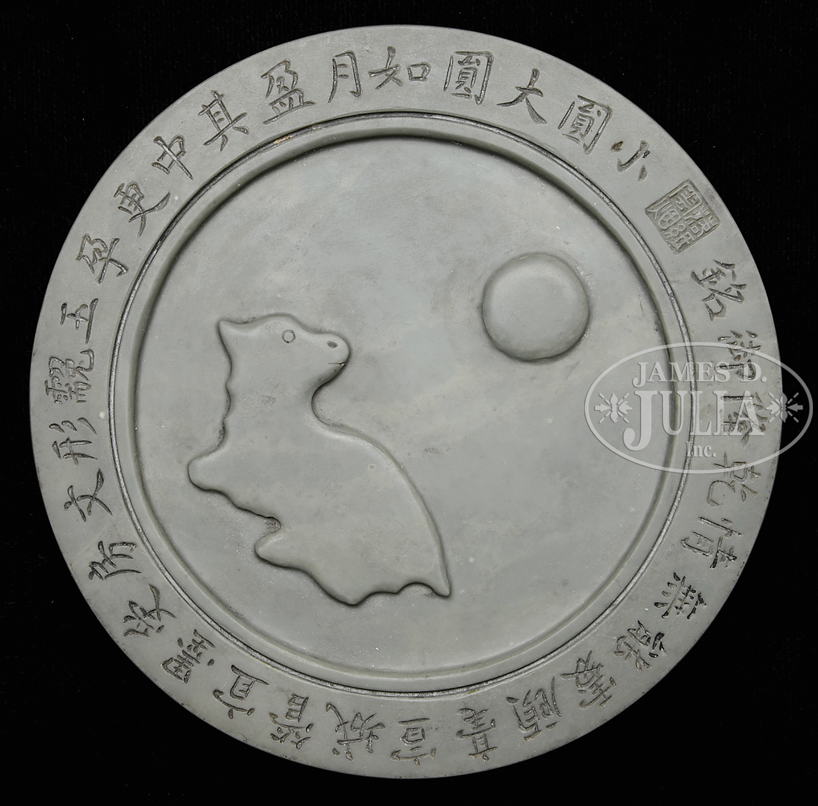 ROUND SONG HUA INKSTONE.China. 4-character Qianlong mark. With a jade rabbit staring at the moon. Fitted round wood box inscribed with calligraphy. SIZE: 4-1/4″ dia. CONDITION: Good. 49073-15 (200-300) – Lot 4082