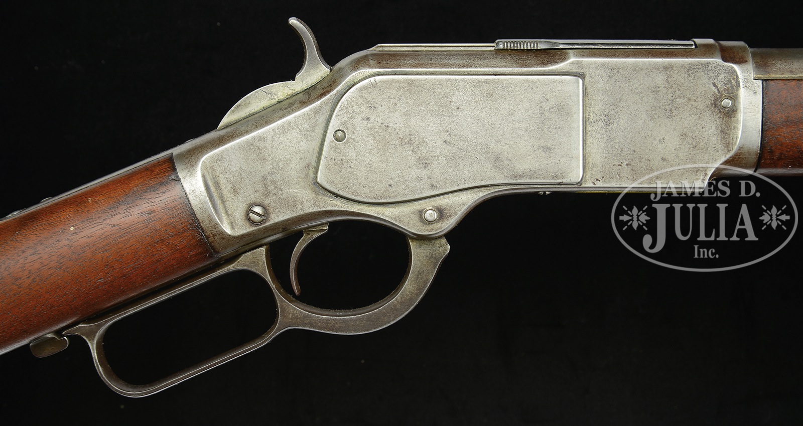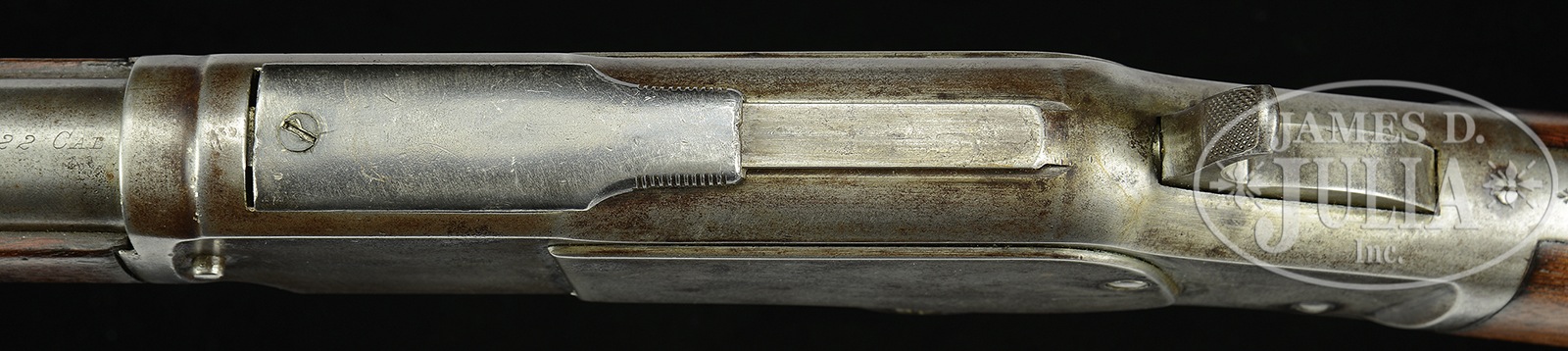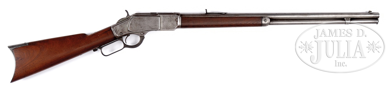 RARE WINCHESTER THIRD MODEL 1873 TAKEDOWN RIFLE IN .22 CALIBER.SN 174952A. Cal. 22 SHORT. 24″ rnd bbl. Full magazine. Take down receiver. Receiver is of stepped variety. Blue finish. Straight grain American walnut stocks with crescent butt. Bbl shows 2-line Winchester address rolled in front of rear-sight. “22 CAL” at breech. Receiver is marked Model 1873 on upper tang with finials. SN is on lower tang behind lever latch. “22 CAL SHORT” is marked on elevator. Take down feature has a pin attachment. No assembly nos. were observed. Accompanying this rifle is a Cody Firearms Company Museum Letter dated October 29, 1993, confirming features and showing shipment on April 2, 1855. Order number 19394. CONDITION: Very good. Bbl and magazine tube show a smooth silver-gray finish with sharp markings. Elevator is missing from rear-sight. Bore is very dark with traces of rifling. Receiver is a silver-gray finish overall with some light pitting and handling marks. Lever screw is a replacement. Dust cover is a replacement and shows some re-blue finish. Elevator is a mustard-yellow patina with a sharp mark and very little denting. All other marks are sharp. Hammer and lever are a silver-brown patina. Hammer has traces of case color on front face. Stocks are very good, full-sized, and show a light cleaning with only small handling marks overall. Buttplate and forend cap are also a smooth silver-gray patina. A very good example of a .22 CAL Take-Down Winchester Model 1873 rifle. 50506-13 (3,500-5,500) – Lot 4085 Click here to view provenance