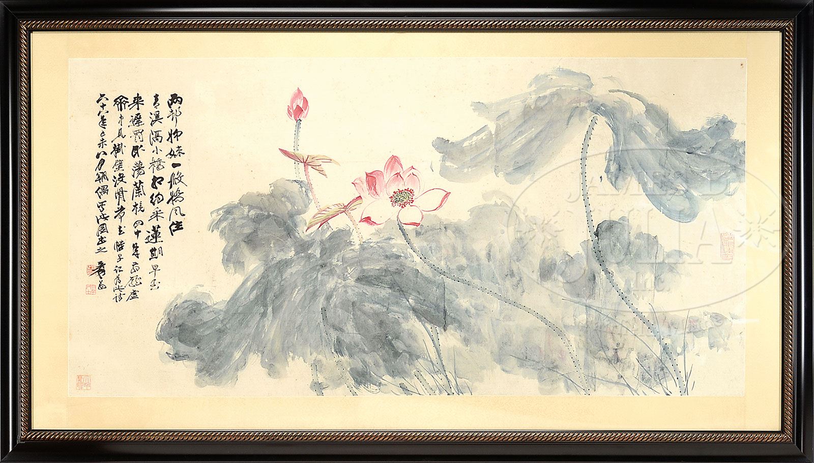 LARGE FRAMED PAINTING IN THE MANNER OF ZHANG DAQIAN. ink and colors on paper, finely depicting a lotus pond, with lengthy inscription, dated “the eighth month of yiwei year,” signed “Yuan,” with four seals “Zhang Yuan zhi yin,” “Daqian ju shi,” “Daqian hao fa,” “Mojiejingshe,” framed and glazed. SIZE: 26-1/4″ x 53-1/4″. CONDITION: Extensive foxing. 9-91600 (800-1,000)