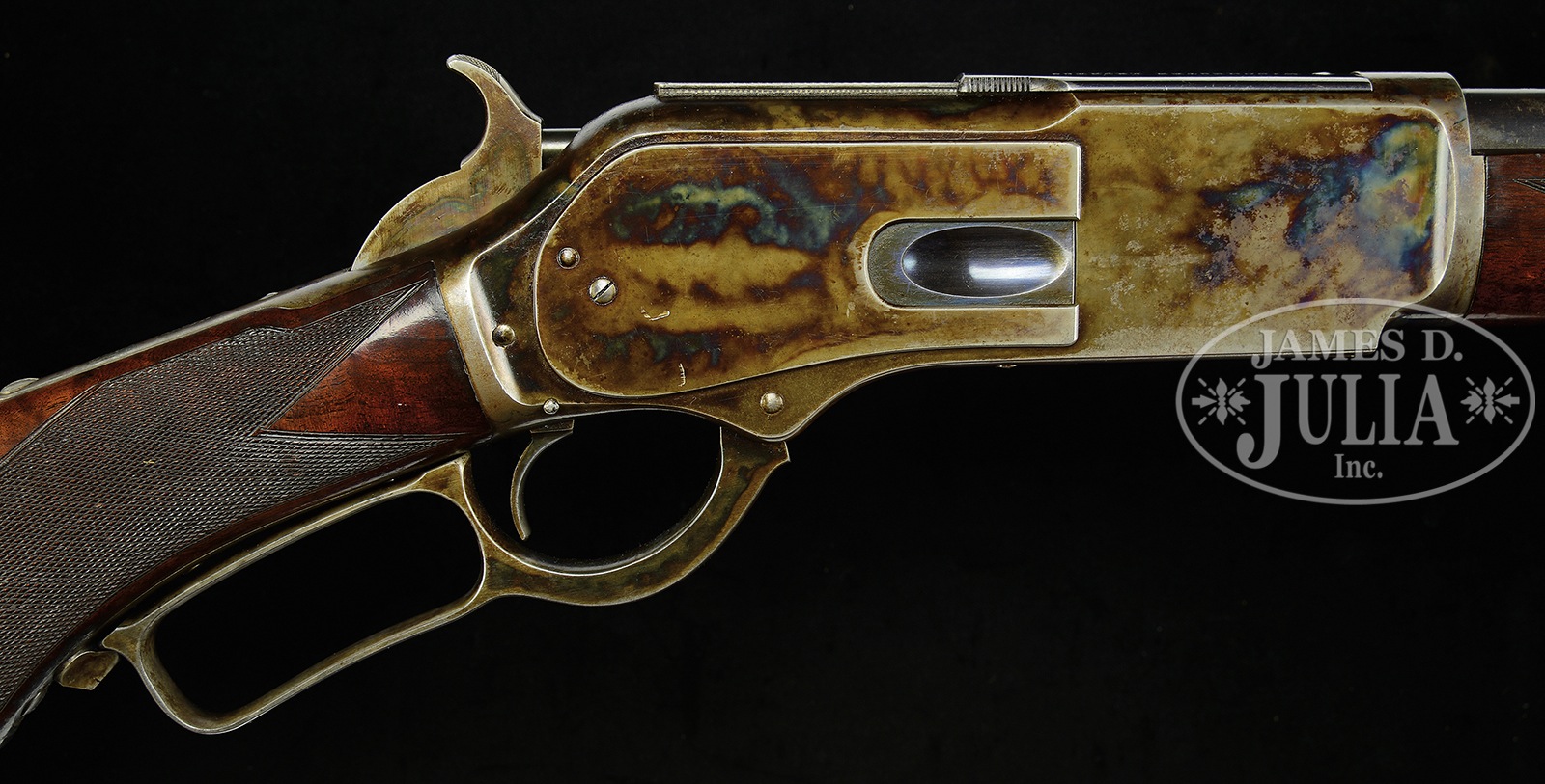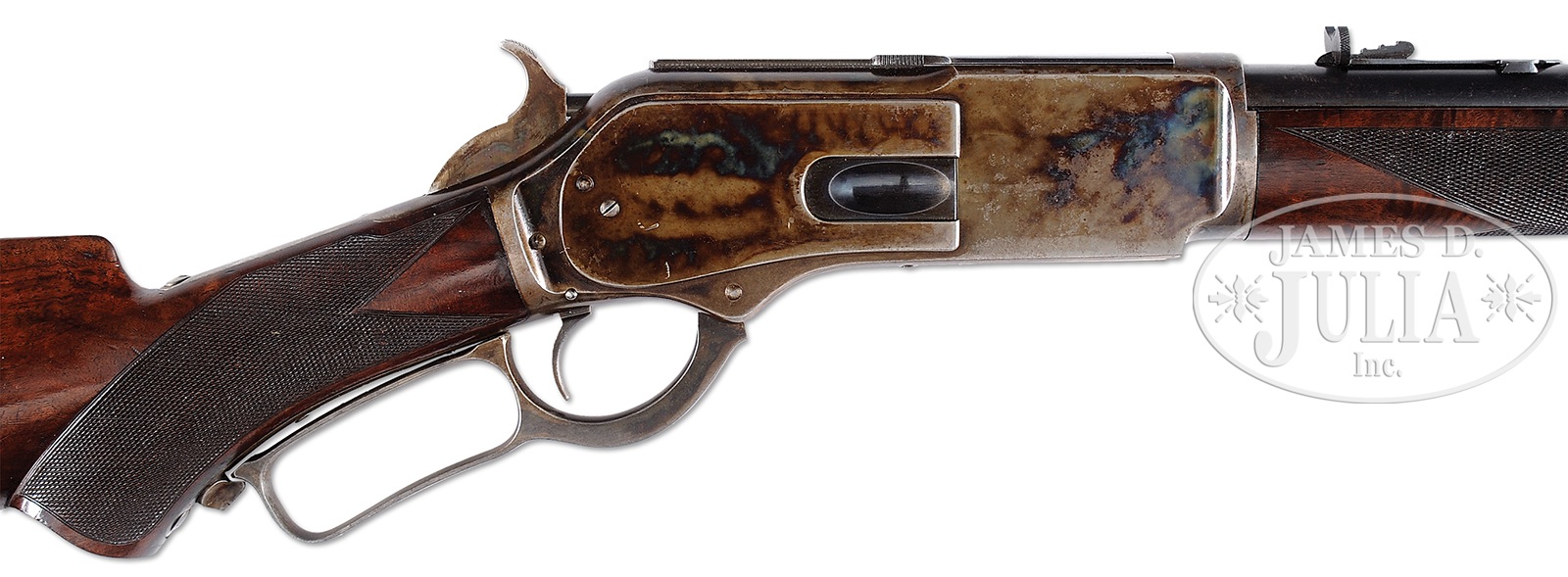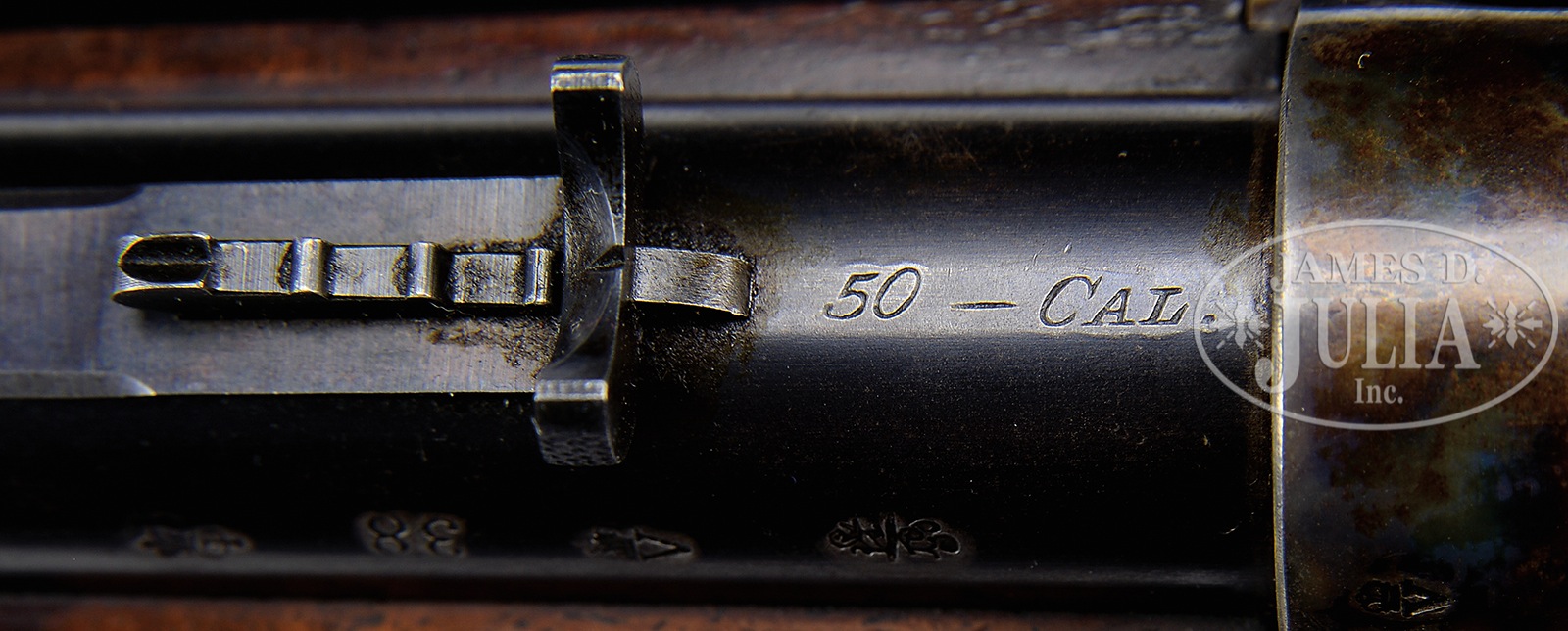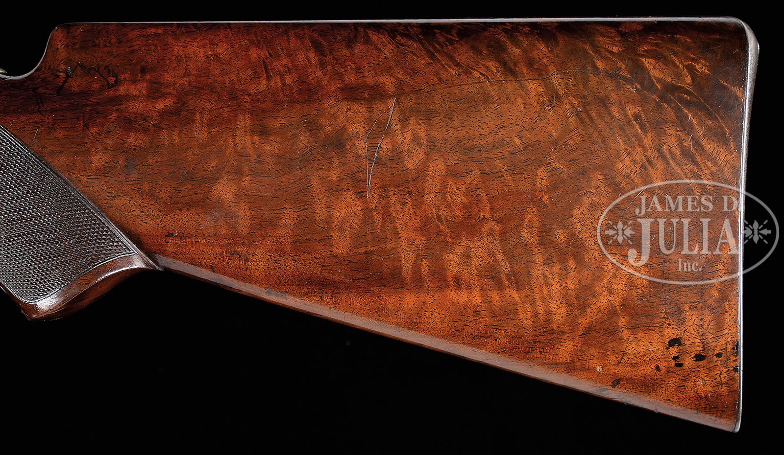 EXTRAORDINARY WINCHESTER MODEL 1876 DELUXE EXPRESS RIFLE WITH 22″ BARREL AND SHOTGUN BUTT.SN 24236. Cal. 50-95. 22″ rnd bbl. Button magazine. Blue and case color finish. Highly figured American walnut stocks with checkered pistol grip and forearm. Bbl shows correct 2-line Winchester address rolled in front of rear-sight with “50-CAL” at breech-end. There are 4 British proofs on left side of bbl at breech. Front sight has a German silver blade, sporting rear-sight. Receiver has Model 1876 stamped on upper tang without finials and is of the second model type with guide rail attached by a screw. SN is stamped on lower tang behind lever latch. There is a small British proof on forward left top of receiver. Dust cover is roll marked “Winchester Express over 50-CAL. 95 GRS”. Elevator is marked “50-95”. Lower tang has assembly no. “332” stamped with “XXX” stamped in front and “S” to rear. Upper tang mortise of buttstock shows assembly no. “332”. Inside toe of buttplate has assembly no. “65” that is double struck. Toe of buttstock under plate, also shows assembly no. “65”. Accompanied by a Cody Firearms Museum Letter dated June 28, 2007, showing rifle, 50-95, 22″ rnd bbl, plain trigger, checkered stocks, half magazine, shotgun butt, case colored finish and “inside finish”, which indicates that the receiver was polished on the inside for smoothness of operation. Grade of stocks is not listed, but is confirmed as being “XXX” by orig tang markings. CONDITION: Very fine. Bbl retains 60% blue finish that has drifted to a smooth plumb-brown patina overall, with a few minuscule scratches. Bbl markings are sharp and clear. Bore is bright with sharp rifling. Receiver retains 70% of the vivid case color with generous traces of lacquer traces remaining. Receiver has a few scratch marks overall, and some high point wear. No roughness. Dust cover retains 90% blue with a sharp mark and some slight scratches. Guide-rail also contains a considerable amount of blue finish. Hammer retains a generous amount of case color with some oil staining on sides and vivid color on front face. Firing pin also retains a generous amount of blue finish. Inside of elevator mortise shows polished finish with traces of case color. Lever shows 50-60% vivid case color finish with a generous amount of lacquer. All markings are sharp. Stocks are fine, full-sized, and retain nearly all of the varnish finish, with sharp checkering and only light handling marks overall. Buttplate is a smooth gray-brown patina with a few rough spots. Forend cap shows vivid case color on both sides with considerable lacquer remaining. A wonderfully preserved Winchester Deluxe Model 1876 Express rifle with special order bbl, destined for the English market. Hard to improve upon. 50668-1 TEP (40,000-60,000) – Lot 4089 Click here to view provenance