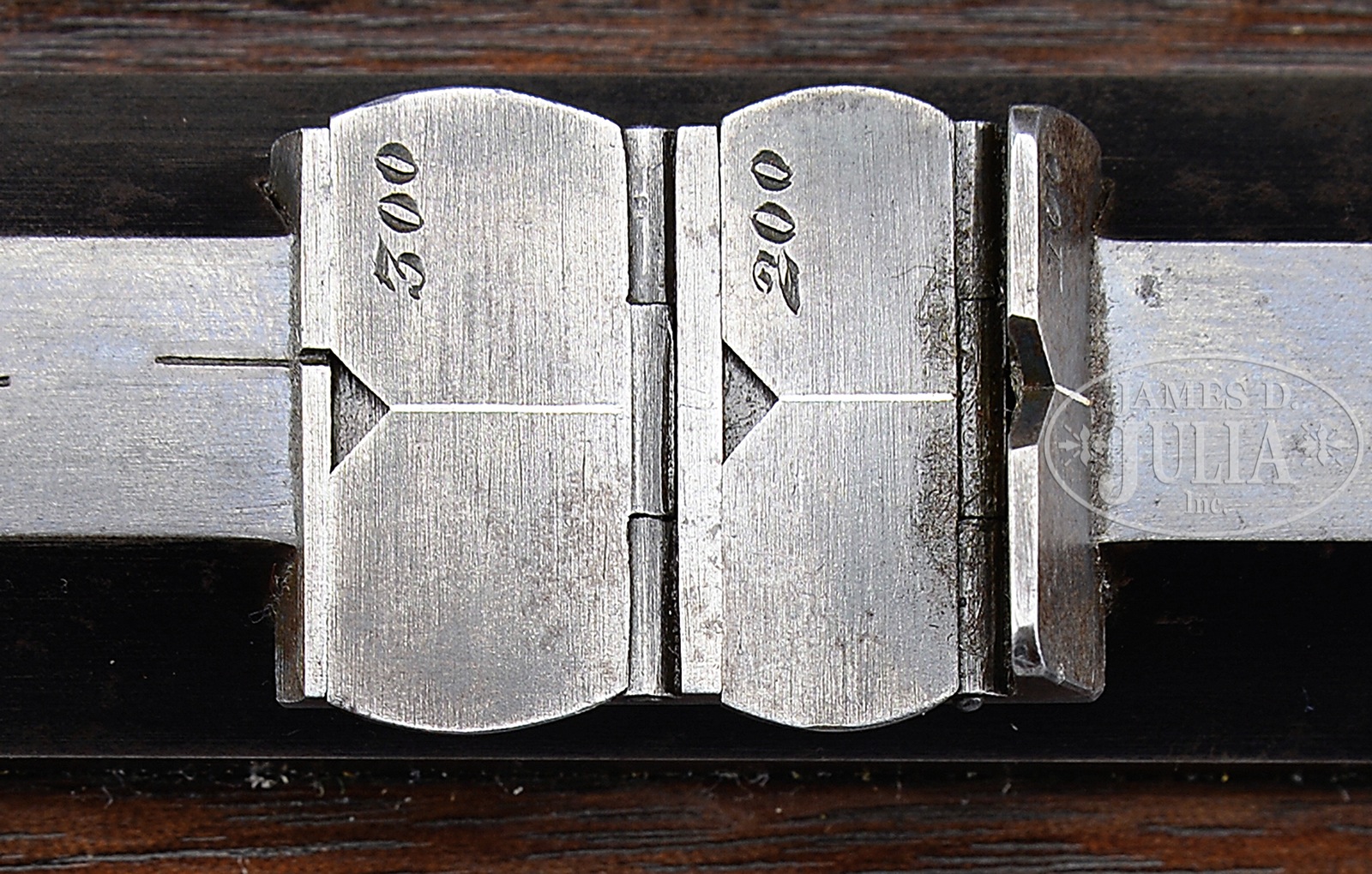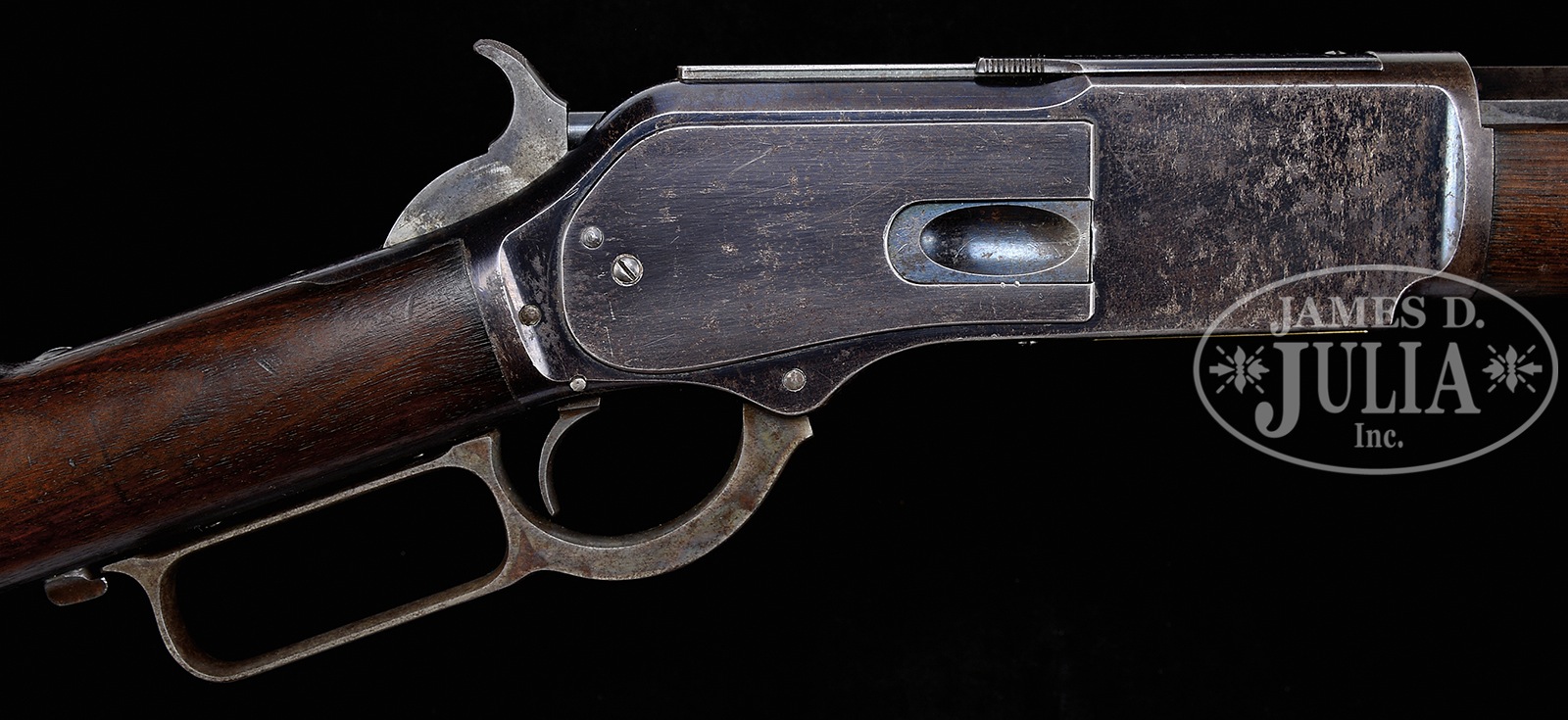 EXTRAORDINARY WINCHESTER SECOND MODEL 1876 EXPRESS RIFLE WITH OCTAGON BARREL, FULL MAGAZINE, CRESCENT BUTT AND SPECIAL SIGHTS.SN 20471. Cal. 50-95. 26″ oct bbl. Blue finish. Straight grain American walnut stocks with crescent butt. Bbl shows standard Winchester 2-line address rolled into front-sight with “50-CAL” at breech-end. Front-sight has a low thin blade with protective ears on either side and has an index mark aligned with one on top flat of bbl. Rear-sight is a 3-leaf variety in 100, 200, and 300 yard graduations. Sight has platinum lines at center of v-notch. There is also an index mark that aligns with one on the bbl. Receiver is of the second model variety with a dust cover guide-rail attached to a screw. Dust cover is marked “Winchester Express over 50-CAL 95 GRS”. Dust cover mark is hand-stamped. Top tang is marked Model 1876 without finials. Lower tang has SN engraved behind lever latch. Elevator is marked “50-95”. Lower tang is stamped with assembly no. “153” on left side. Upper tang mortise and inside toe of buttplate is also stamped “153”. 4-pc steel cleaning rod in butt. CONDITION: Fine. Bbl retains 20-30% blue finish blending with a plumb-brown patina with a few stains on top and muzzle end. Sights are fine. Bbl markings are sharp. Magazine tube retains 20% blue finish in protected areas, blending with a smooth plumb-brown patina. Receiver shows 50-60% blue finish with some staining on forward right side and left sideplate. Dust cover also retains 50-60% blue finish with the balance a smooth plumb patina and a sharp mark. Loading gate retains traces of fire-blue. Elevator is a mustard-yellow patina with a sharp mark and a couple of scratches. Hammer shows vivid case color on left side and rear. Right side is a silver-gray patina with slight scratches. Lever has generous traces of case color overall that is vivid in protected areas at hinge. Stocks are fine, full-sized, and show nearly all of the oil finish with only light handling marks overall. Buttplate shows traces of blue on forward end of tang with the balance being a mottled brown patina, with some roughness at heel. Forend cap shows 60% blue finish turning a plumb-brown with a few scratches. A wonderful example of a Octagon Barrel Full Magazine, Crescent Butt Express rifle in 50-95 cal with special sights. Manufactured in 1881. 50664-1 TEP (10,000-15,000) – Lot 4091