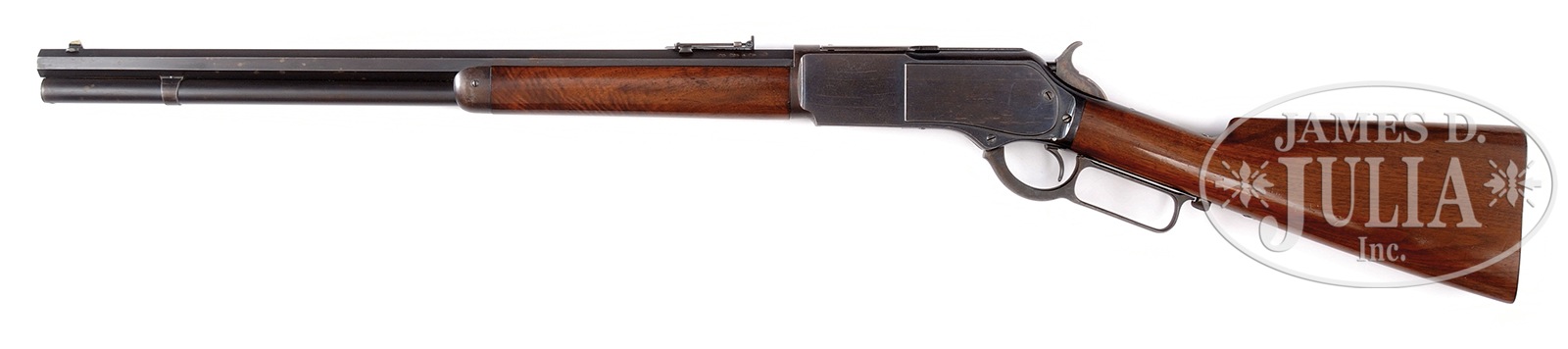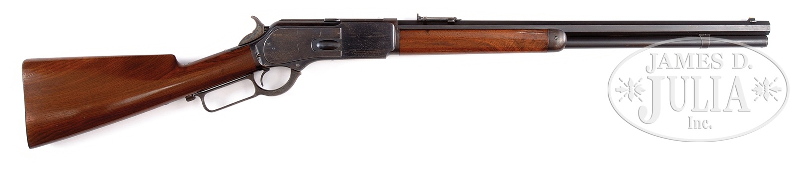 RARE WINCHESTER THIRD MODEL 1876 SHORT RIFLE.SN 51730. Cal. 45-75. 22″ oct bbl. Blue finish. Straight grain American walnut stocks with steel shotgun buttplate. Bbl shows standard 2-line Winchester address rolled into front-sight with cal mark at breech-end. Bbl has 4 English proof-marks on left side near rear-sight. Rear-sight has “1876” stamped at top of staff. Upper tang receiver is stamped Model 1876 with finials. SN is stamped on lower tang behind lever latch. Elevator is stamped “45-75”. There is a small British proof stamped on left forward edge of receiver. Lower tang has assembly no. “994” stamped on left side followed by “S”. Upper tang mortise of buttstock has assembly no. “904” as does the inside toe of buttplate. This could possibly be a factory error because stocks fit perfectly. Forend is the correct 8-3/8″ length. CONDITION: Very fine. Bbl and magazine tube both retain 40% orig blue finish, that is drifted to a plumb-brown patina toward muzzle with some stain on left side and high point wear. Bbl marks are sharp. Bore is bright with strong rifling. Receiver retains 50-60% blue finish that is drifting to a plumb-brown patina overall with some small scratches. Loading gate has traces of fire-blue. Dust cover has 50% blue blending with a smooth plumb-brown color. Elevator is a mustard-yellow patina with some light cleaning marks and a sharp mark. Hammer shows nearly all of the deep case color finish. Lever is a mottled silver-brown patina with generous traces of case color in protected areas. Stocks are fine and retain nearly all their varnish finish with some light handling marks overall. Buttplate retains 20% blue with some staining at heel and toe. Fore end cap shows traces of blue with balance a plumb-brown patina. A very fine example of a desirable Winchester Model 1876 short rifle. 51087-11 TEP (8,000-12,000) – Lot 4094