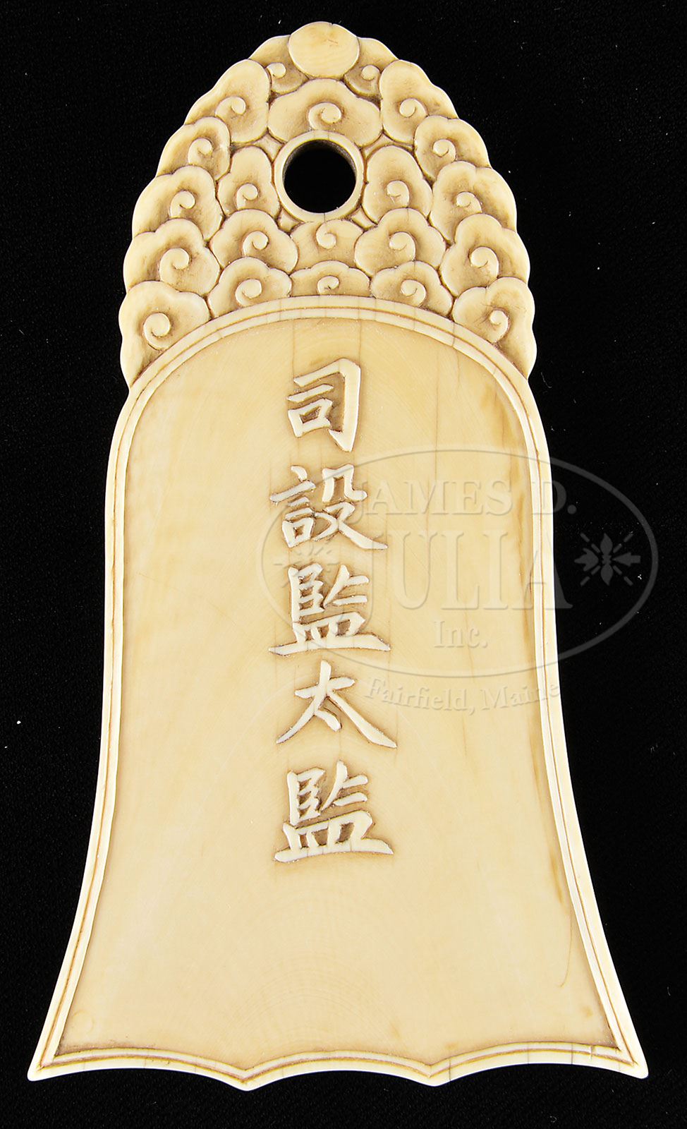 IVORY PLAQUE. 18th century, China. Bell shaped ivory plaque with a cloud shaped finial, six-character inscription on one side, and a five-character inscription on the reverse, probably a Palace pass). SIZE: 4-3/4” t x 2-1/2” w. CONDITION: Very good. 9-91620 (400-600)