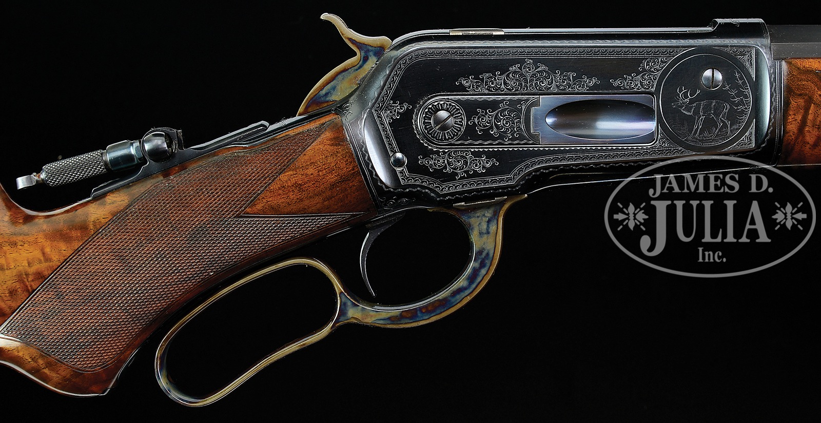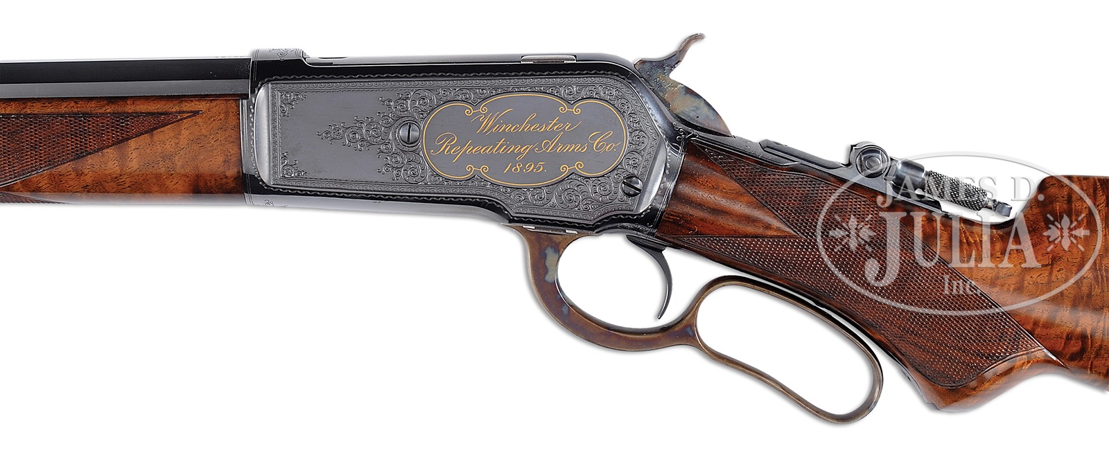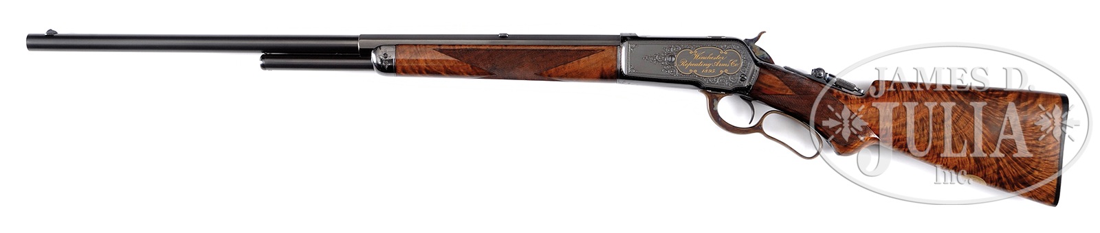 EXTREMELY RARE ENGRAVED & GOLD INLAID WINCHESTER MODEL 1886 LEVER ACTION FACTORY EXHIBITION RIFLE.SN 99580. Cal. 45-70. Spectacular ’86 with 26″ oct to rnd bbl, 2/3 magazine, ivory bead hunting front sight, slot blank in rear seat & Lyman tang sight. Receiver is factory engraved probably by John Ulrich, in a modified #10 style with a large panel on left side inlaid in gold script “Winchester / Repeating Arms Co. / 1895.” all surrounded by gold wire inlay. Right side has the vignette of a bugling bull elk. Mounted with 3-4X, extremely beautiful flame & shell grain American walnut with H-style checkered forearm and serpentine grip with black insert and Winchester hard rubber buttplate. Left side of lower tang is marked with assembly number “467”, a factory defaced assembly number “1140”, “XXS”. The “467” assembly number and the defaced assembly number are both found in top tang channel of buttstock. Bottom of buttstock has an inlaid gold initial oval inscribed with the intertwined “WRACO” initials. Accompanied by a Cody Firearms Museum letter which identifies this rifle in caliber 45-70, half oct bbl, plain trigger, checkered stock with pistol grip, Lyman combination front sight and flat top sporting rear sight, 2/3 magazine, shotgun butt with rubber buttplate, inlaid in gold, $5.00 engraving, blue frame and “WINCHESTER R.A. CO. 1895”, received in warehouse May 23, 1895 and shipped same day to Order #11542, repair & return Jan. 6, 1899. It seems most likely that when this rifle was returned in 1899 it was factory refinished and the new assembly numbers stamped on tang & buttstock. Very likely the sights were changed at the same time. This rifle is pictured on p. 227 of The Book of Winchester Engraving, Wilson, and on p. 240 of Winchester Engraving, Wilson. Mr. Wilson notes that “It is likely the rifle was used as a sample or show gun.” PROVENANCE: Ex-Ivan B. Hart Collection; Ex-Wes Adams Collection. Special Note: This item(s) contains plant or animal properties that may be covered by the Endangered Species Act (ESA). We have taken care to ensure that this item(s) meets the standard for sale under the ESA. However, certain states and other countries have laws that are more restrictive than the ESA. It is the bidder’s responsibility to ensure that it is lawful to purchase or transport this item(s) into their state, and to obtain the necessary import and export approvals. Delay or failure to obtain any such permit or approval does not relieve the buyer of paying for the item(s) and consummating the purchase. CONDITION: Extremely fine. Overall retains virtually all of its fine, bright factory restored finish to both metal & wood showing no evidence of use since restoration. Mechanics are crisp, bright shiny bore. 50412-24 (40,000-80,000) IVORY – Lot 4106 Click here to view provenance