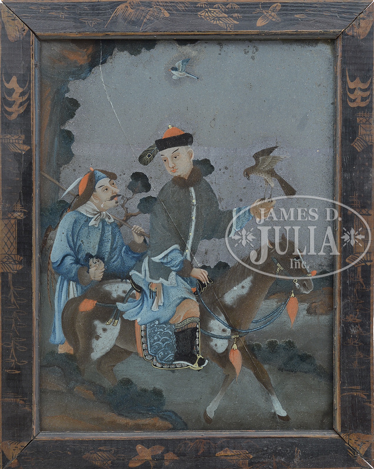 EXPORT REVERSE GLASS PAINTING.19th century, China. Depicting a Manchurian falconer and his attendant. Framed. SIZE: Sight: 15-1/4″ x 11-1/8″. CONDITION: Large diagonal crack. Otherwise good. 1062-18 (200-300) – Lot 4109